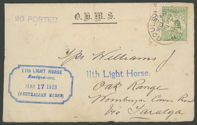 1913 (May 17) OHMS cover (front & flap only) with superb fancy '11th LIGHT HORSE/Headquarters/MAY 17 1913/(AUSTRALIAN HORSE)'