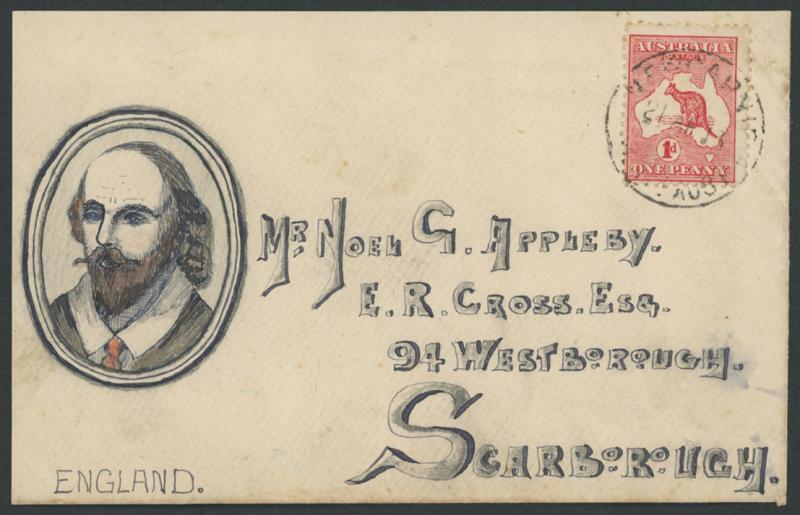 1913 (April 21) hand-illustrated envelope with a cameo portrait of William Shakespeare by Herbert G Appleby to England with