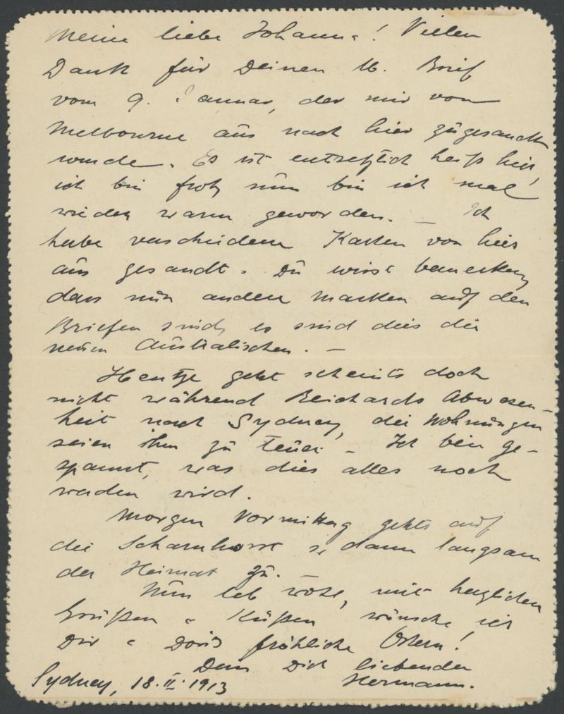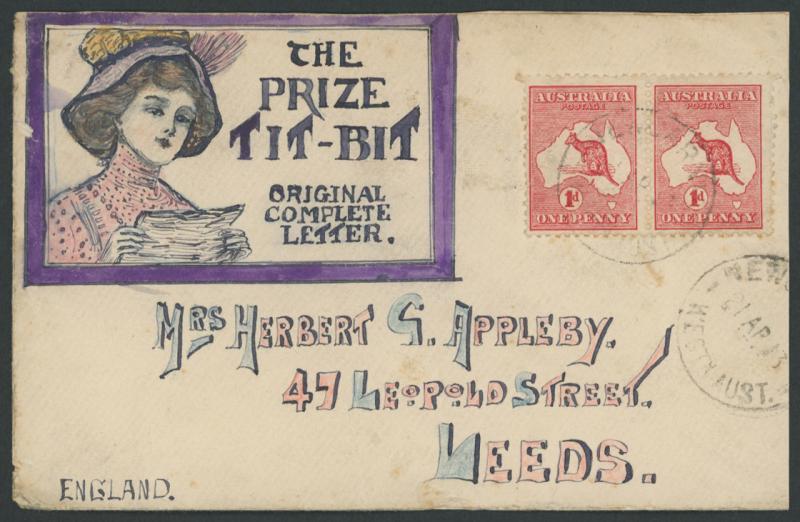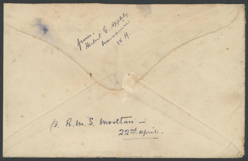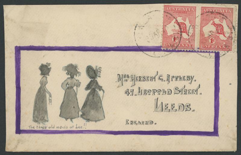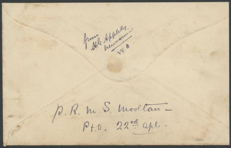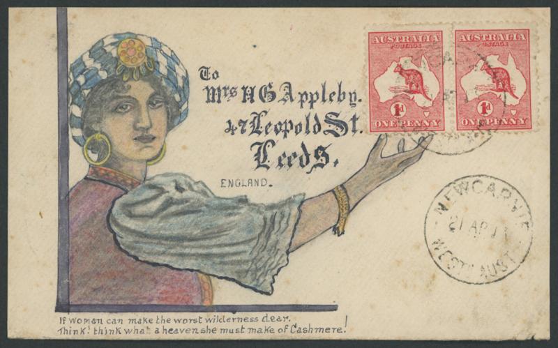 Complete Letter' by Herbert G Appleby to his wife in England with Kangaroo 1d red Die I pair tied by light 'NEWCARNIE/WESTN AUST' cds, endorsed on the reverse "p RMS Mooltan/22nd April", slightly trimmed at right and a few minor blemishes. Ex David
