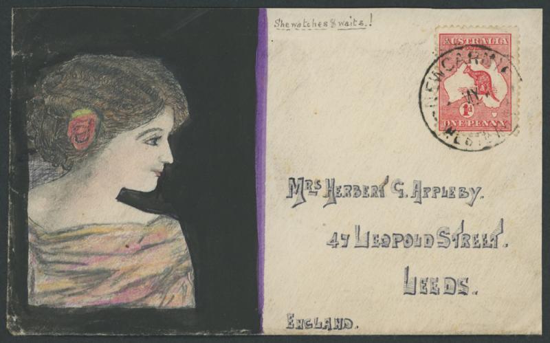 1913 (May 5) hand-illustrated envelope showing a young lady with a rose in her hair by Herbert G Appleby to his wife in England