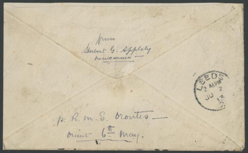 with Kangaroo 1d red solo tied by a largely fine complete strike of 'NEWCARNIE/WESTN AUST' cds, endorsed on the reverse "p RMS Orontes/Orient 6th May" with 'LEEDS/JU 2/13' arrival backstamp, slightly trimmed at right and a few minor blemishes. The