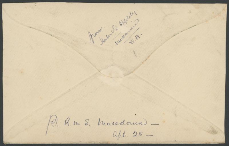 Appleby to his wife in England with Kangaroo 1d red Die I pair tied by light 'NEWCARNIE/WESTN AUST' cds, endorsed on the reverse "p RMS Macedonia/Apl 28", slightly trimmed at both sides and a few minor blemishes. Ex David Adams. (Image1) (Image2)