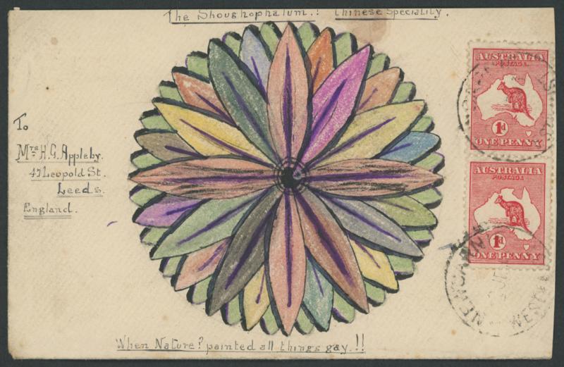 1913 (June 2) hand-illustrated envelope showing a kaleidoscope titled 'The Shoughophalum: Chinese Speciality/When Nature painted