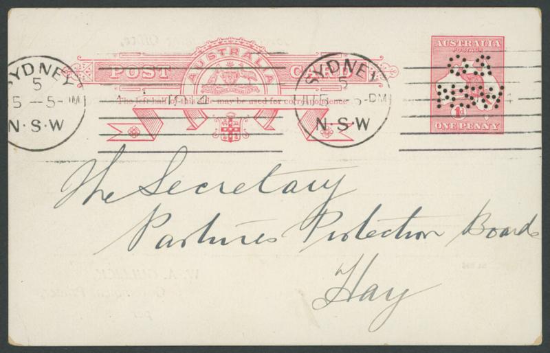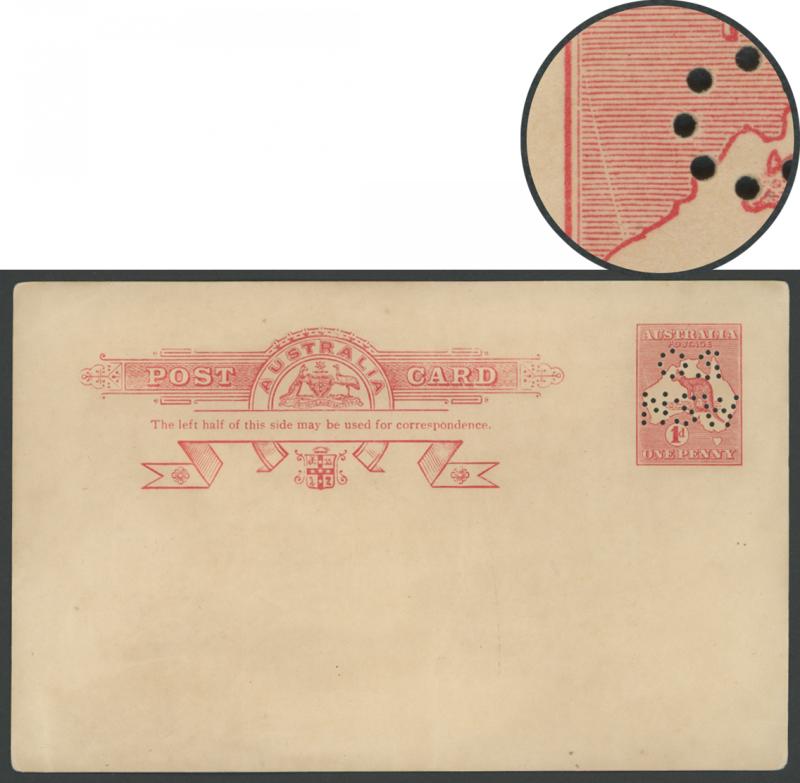 POSTAL CARDS: Kangaroos 1d red Die I on white surfaced stock Punctured 'OS/NSW' ACSC P24eb with printed message for Government