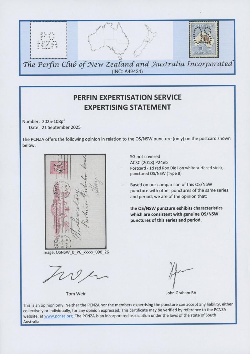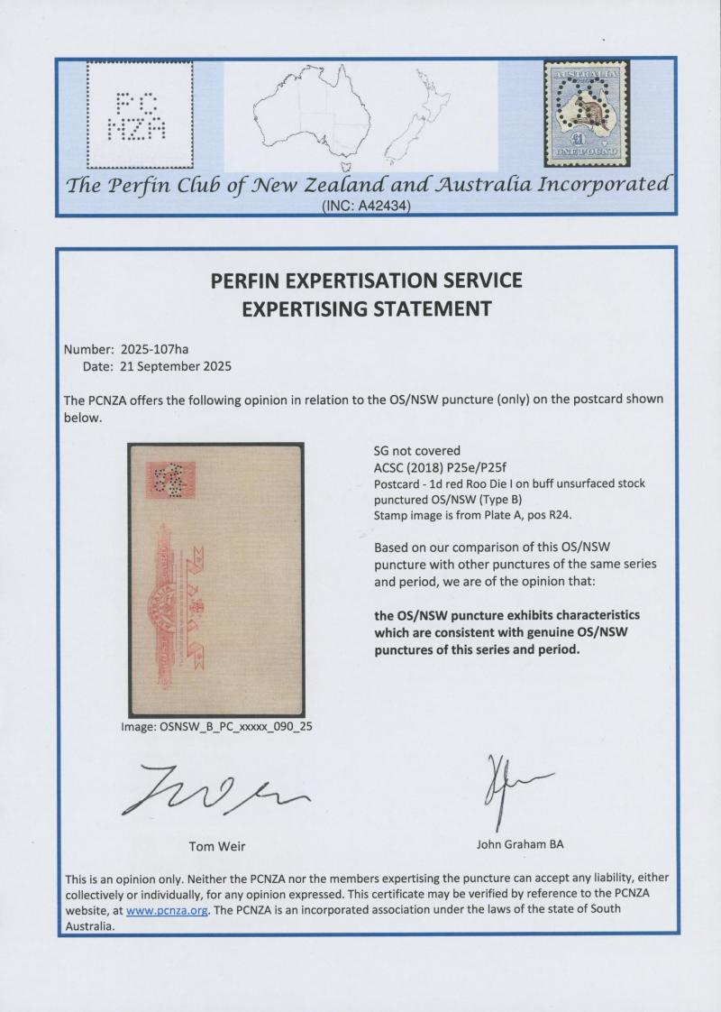 POSTAL CARDS: Kangaroos 1d red Die I on buff unsurfaced stock Punctured 'OS/NSW' ACSC P25e additionally with Diagonal Scratch from