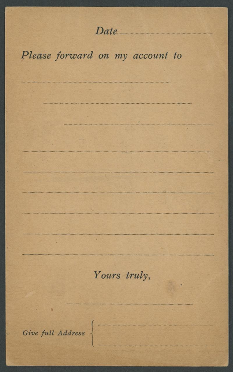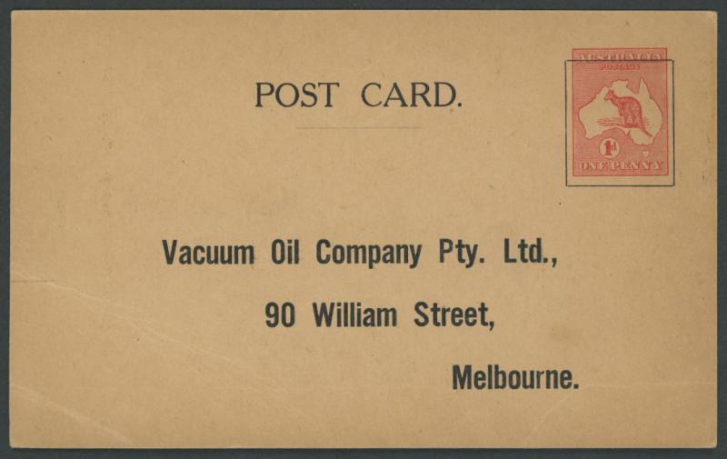 POSTAL CARDS - STAMPED-TO-ORDER: Kangaroos 1d red Die I on buff unsurfaced card with pre-printed stamp 'box' and return address for