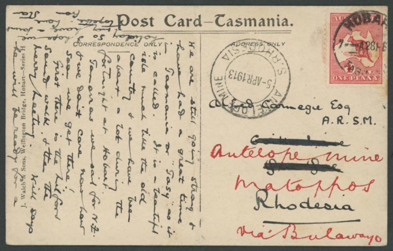 by Hobart cds, redirected to 'Antelope Mine, Matoppos via Bulawayo" with largely very fine complete 'ANTELOPE MINE/5-APR.1913/S.RHODESIA' arrival datestamp on the face, horizontal fold clear of the adhesive & markings. The rate was 1d British Empire