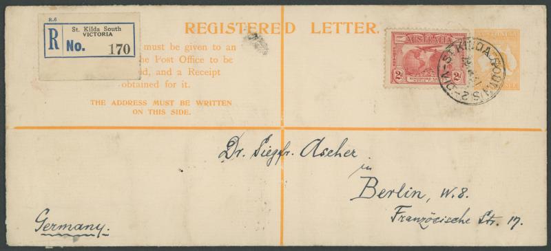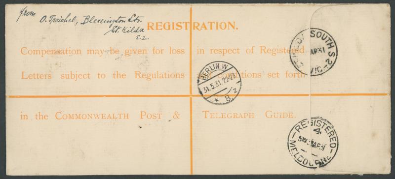 tied by 'ST. KILDA SOUTH S.2/29.4.31/VIC' cds cancel with blue & black/white R label at upper-left, Melbourne transit and 'BERLIN W/31.5.31' arrival backstamp, a few light bends & minor transmission marks. The rate was 3d foreign letter plus 3d