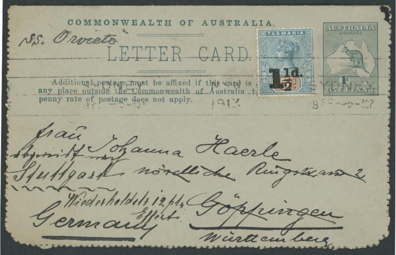 personal message that mentions the writer is leaving the next morning on the steamer 'Scharnhorst', endorsed per "S.S. Orvieto" with Tasmania Tablet 5d '1½d' Surcharge added tied Sydney '1913/18FE' continuous roller machine cancel, a few minor
