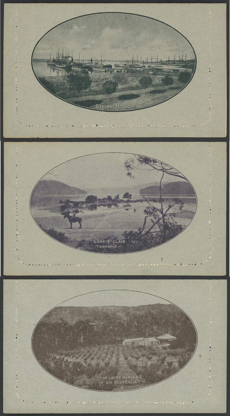 (bridge & waterfall) x3, 'GEELONG HARBOUR' (shipping), 'LAKE ST CLAIR/TASMANIA' (horse), 'LORNE/VICTORIA' with sky & without sky x2, 'MT LOFTY RANGES/SOUTH AUSTRALIA' (horse & buggy; no sky), 'MT LOFTY RANGES/STH AUSTRALIA' (homestead), etc, good