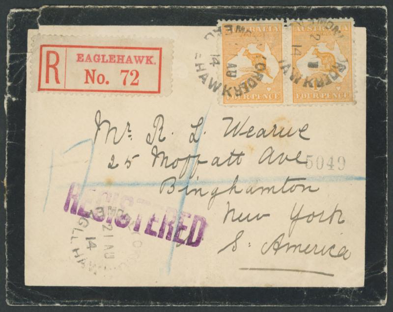 1914 (Aug 21) mourning cover unusually registered to New York USA with scarce franking of Kangaroos First Wmk 4d orange horizontal