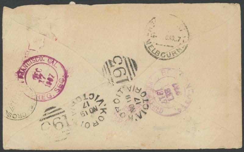 pair tied by unframed 'MONEY ORDER/EAGLEHAWK' (Vic) cds with red/white R label alongside, San Francisco backstamp and American 'REGISTERED' handstamp in purple, minor repaired opening faults. Sold at an Australian auction in 2008 for $1900. Rare