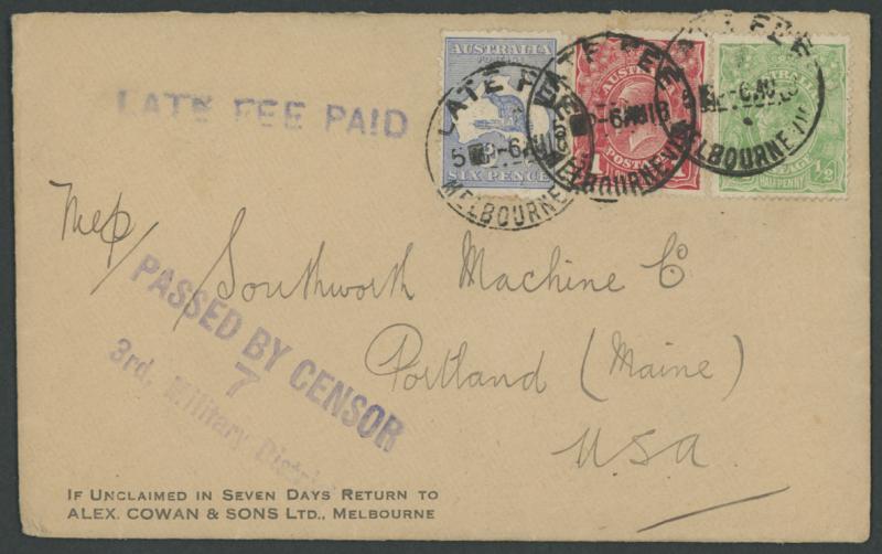 1918 (Aug 6) merchant's cover to Maine USA uprated with Kangaroos 6d blue & KGV ½d green & 1d red tied by 'LATE FEE/MELBOURNE' cds,