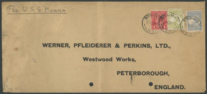 office in Cambridgeshire UK unusually per American ship USS 'Moana' with First Wmk 3d (defective) & 6d blue (probably Second Wmk, Cat $1500 on cover) plus KGV 1d red tied by 'SYDNEY/ 50 ' cds, a few faults including heavy central vertical fold well