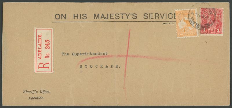1916 (Feb 28) OHMS cover with 'Sheriff's Office/Adelaide' imprint at lower-left to "The Superintendent/Stockade" with 'OS' perfins