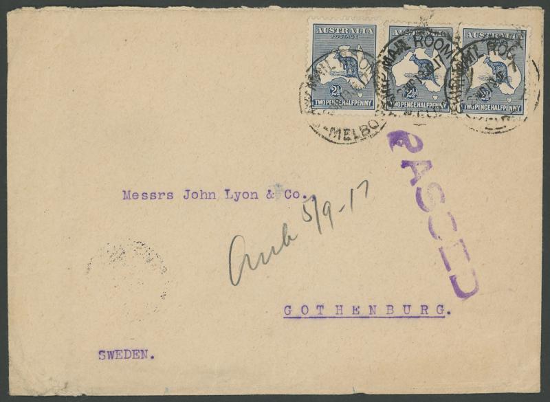 1917 (June 19) triple-rate cover to Sweden with Third Wmk 2½d indigo single & pair tied by 'SHIP MAIL ROOM/MELBOURNE' cds, 'PASSED'