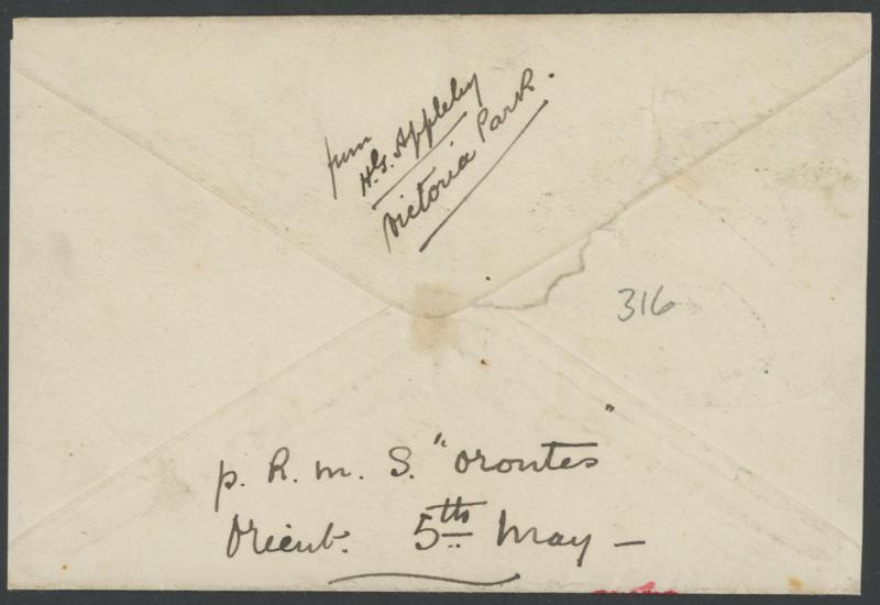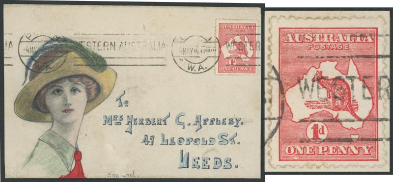 wife in England with Kangaroos 1d red Die II (Plate F Substituted Cliché with additional flaw Island off Queensland Coast [Pos L19] ACSC 3(F)e; Cat $100 for used) solo tied by Perth machine cancel, endorsed on the reverse "p RMS Orontes/Orient 5th