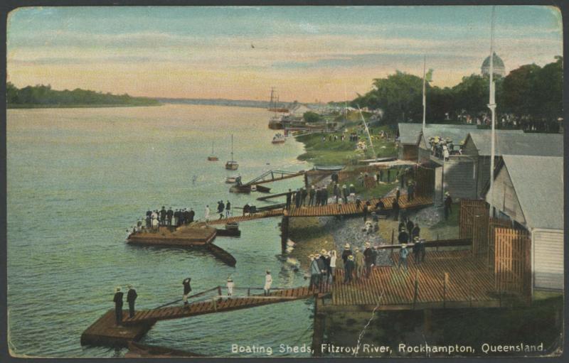 1914 (July 3) usage of Rockhampton (Qld) 'Boating Sheds, Fitzroy River' picture postcard to "Siam" (Thailand) endorsed "per RMS