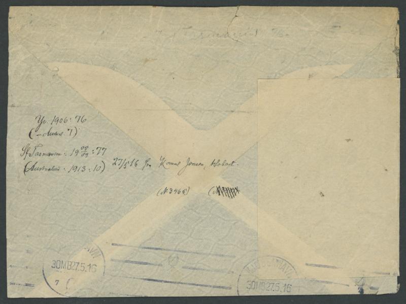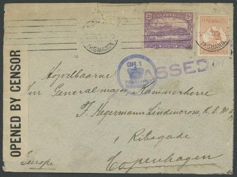 Hobart continuous roller machine cancel, censored locally with Hobart 'CH.1/PASSED BY/CENSOR' crowned circular cachet in blue on the face and again in transit with Melbourne 'OPENED BY CENSOR' black/white resealing label at left & 'PASSED' cachet in