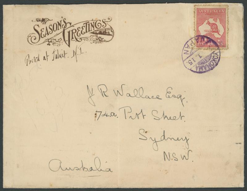 1914 (Dec) 'Season's Greetings' slightly oversize Christmas card envelope endorsed "Posted at Jaluit MI" [Marshall Islands], to