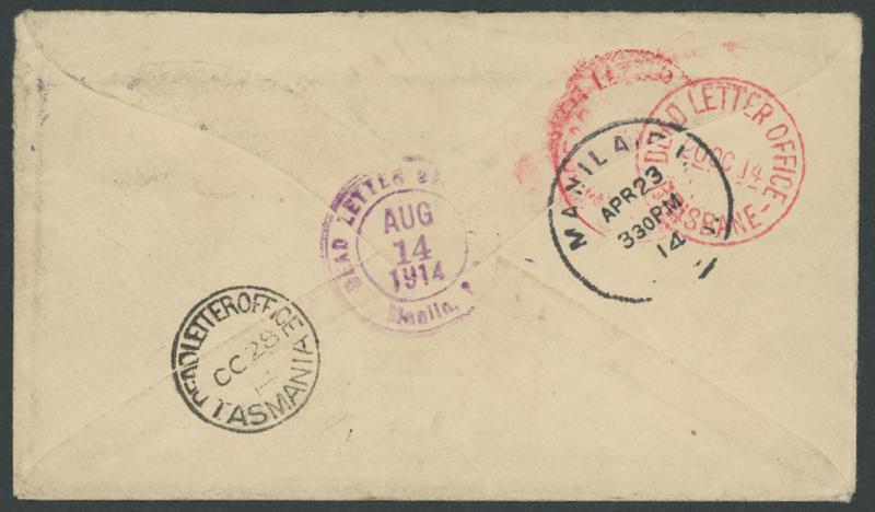 [centimes], undeliverable with various transits, 'ADVERTISED/JUN/15/1914/MANILA P.I.' triple-circle instructional datestamp and 'UNCLAIMED' & 'NON RECLAME' cachets all in violet on the face and 'DEAD LETTER OF[FICE]/AUG/14/1914/Manila P.[I.]'