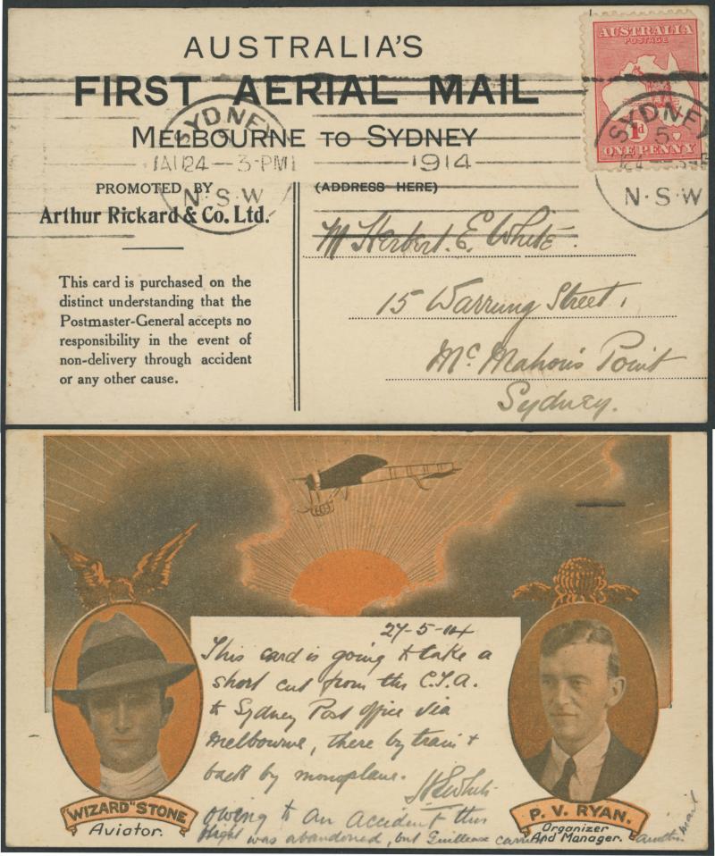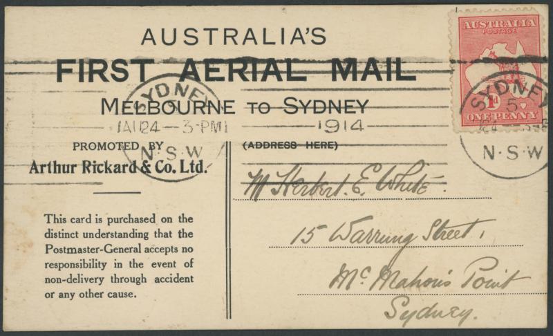 MAIL/MELBOURNE TO SYDNEY' showing their Bleriot Bi-Plane and 'Promoted by Arthur Rickard & Co Ltd' printed on the reverse, correctly franked with Kangaroo 1d red (rounded corner) tied by Sydney arrival continuous machine cancel AAMC 2, a few minor