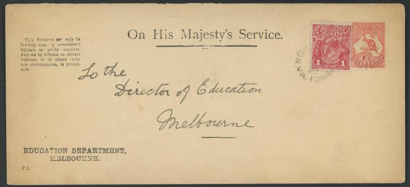 1915-23 usages of Kangaroos 1d red with 'OS'-of-Dots-in-Die long-format envelopes ACSC EO1A-D Types for the Education Department,