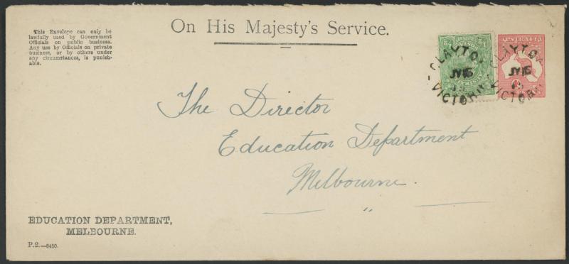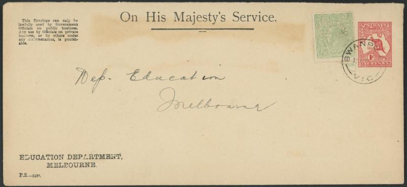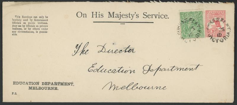 Melbourne with printed 'OHMS' heading & 'Penalty' notice at upper-left, comprising 1915 Type C with KGV ½d green added tied 'CLAYTON/VICTORIA' unframed cds, 1919 Type D with KGV ½d green added tied 'BURKE'S FLAT/VICTORIA' unframed cds, 1919 Type B