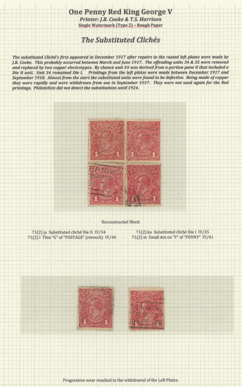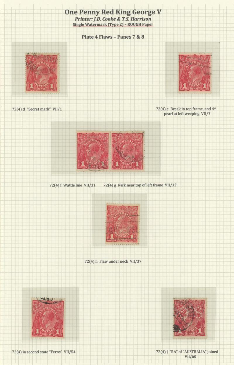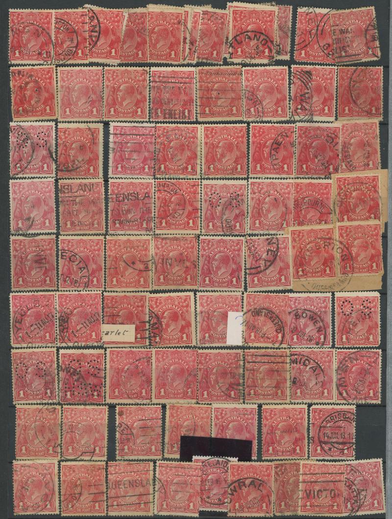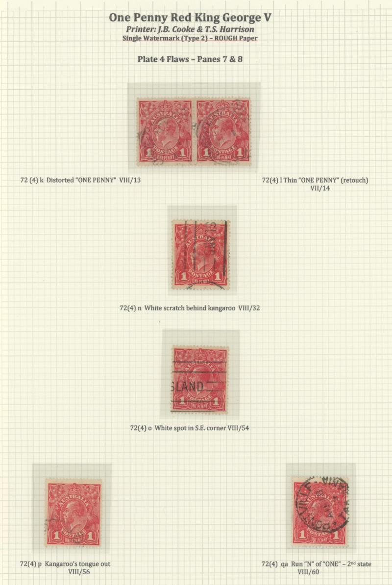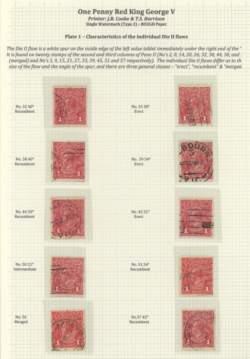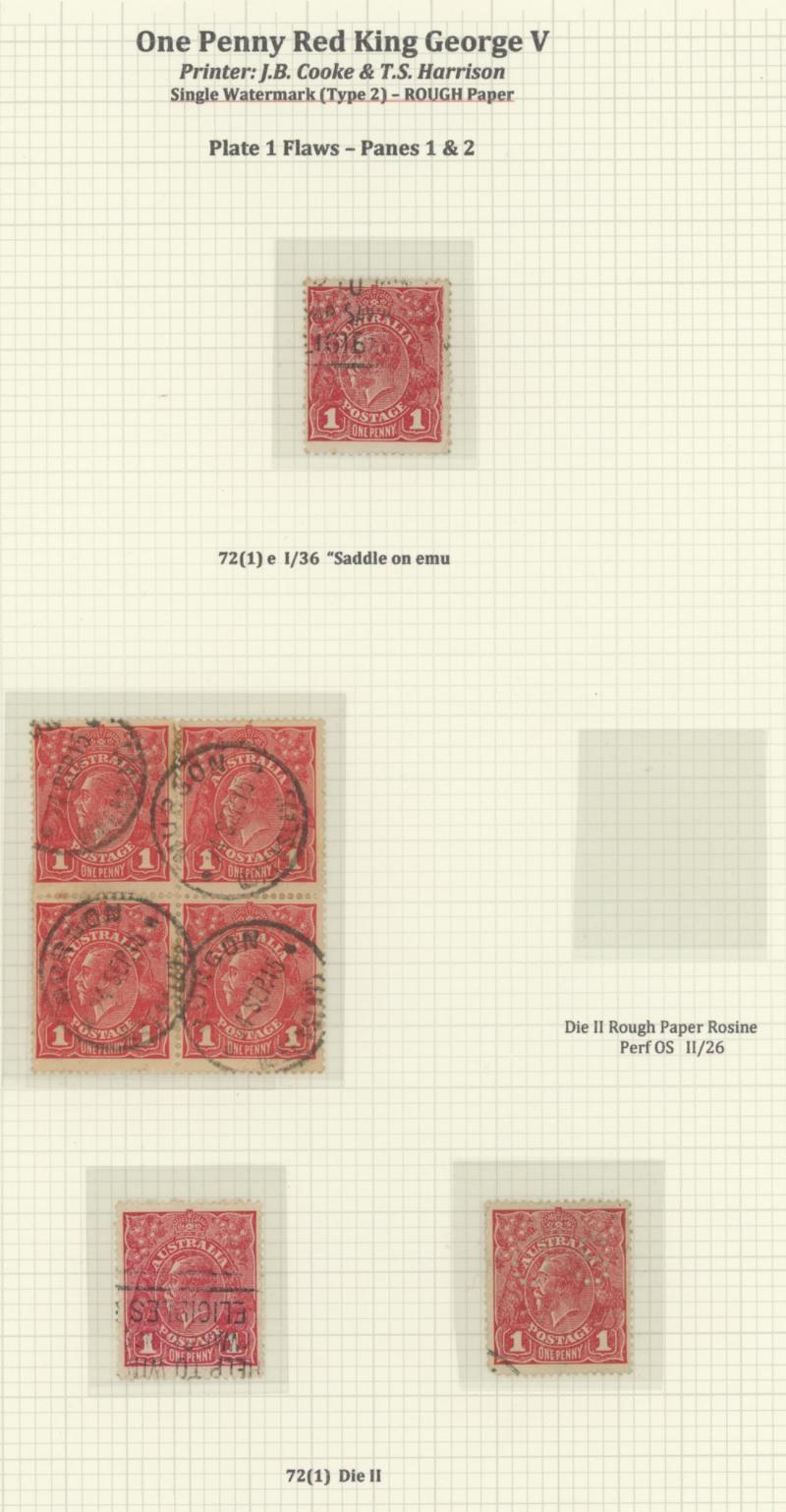 1369 O image1d red Rough Paper ACSC 72 (SG 47) used selection including Die I / Die II block of 4, Die II reconstruction stated to be one example from each of the 20 positions plus punctured 'OS' singles x2 one 'rosine', many ACSC-listed varieties including Substituted Clichés Die I & Die II x4 each, Thin 'G' & Pregnant 'Y' x2 each, Saddle on Emu, 'PENAVY', Rusted Top Right Corner, Colour Flaw outside Frame opposite Emu, Run 'N' of 'ONE' Second State, etc, also Dry Ink, Pre-Printing Paper Fold, Foreign Matter on Plate, and a couple of Tin Shed flaws, condition a little variable but most are fine to very fine, Cat $4500+. Ex Graeme Stephensen (on his annotated display pages). (70+) (Image1) (Image2) (Image3) (Image4) (Image5) (Image6) (Image7) (Image8) (Image9) (Image10) (Image11)
