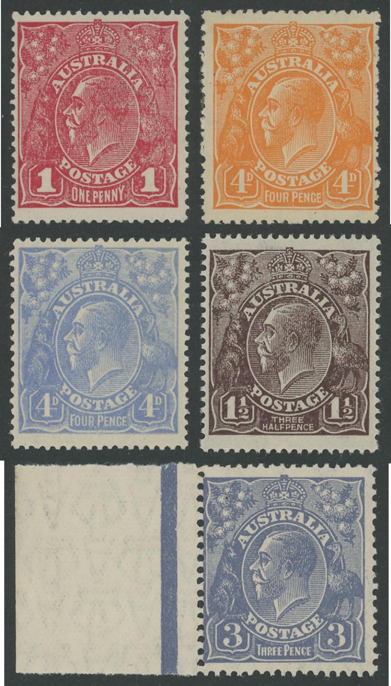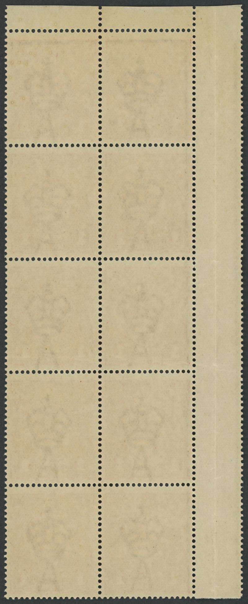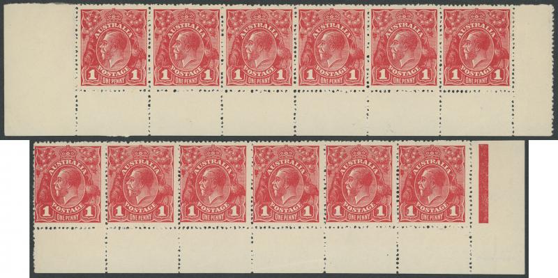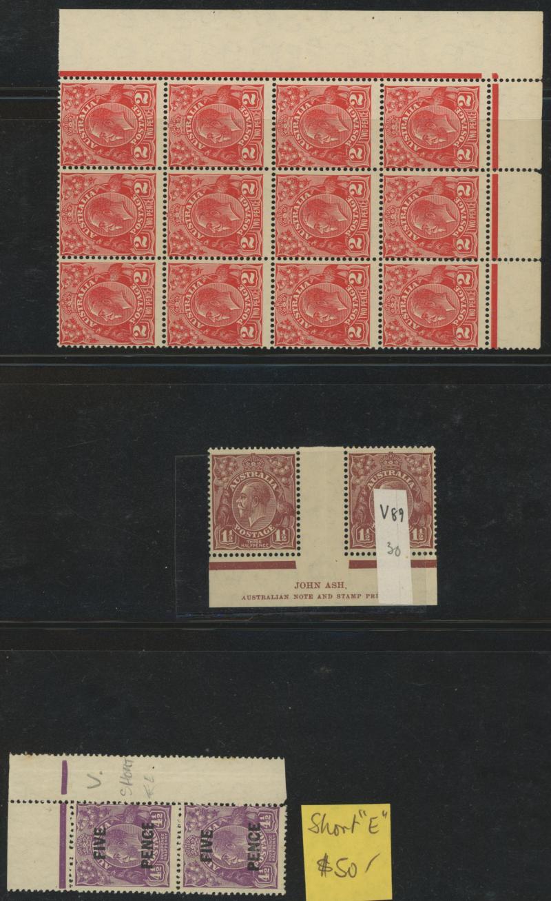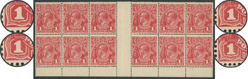1368 nh image1d carmine-rose Smooth Paper Comb Perf SG 21c Plate 4 marginal block of 10 (2x5) from the upper-left corner of the right pane, the lower row with 'NY' of 'PENNY' Joined [Pos VIII/25], the central row with Distorted 'ONE PENNY' and Thin 'ONE PENNY' [Pos VIII/13-14] ACSC 71(4)k, l & o, unusually well-centred for a multiple of this size, unmounted, Cat $1600+ for singles. Superb. The 'NY' of 'PENNY' Joined flaw did not develop until July 1918. Ex Arthur Gray - sold at our auction of 23.5.2016 for $2232 (Sale 213 Lot 110) - and Graeme Stephensen. (Image1) (Image2)