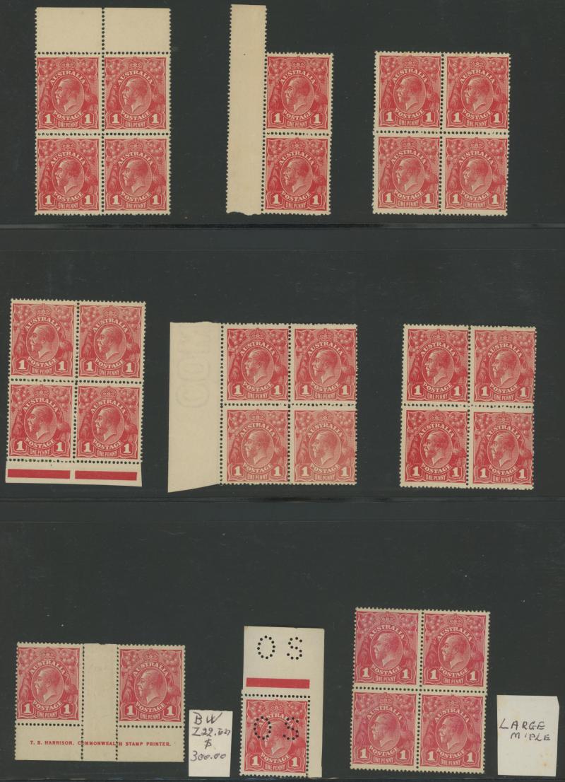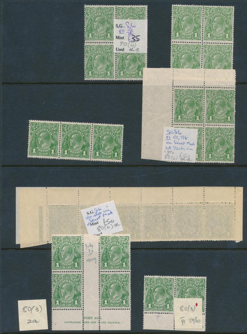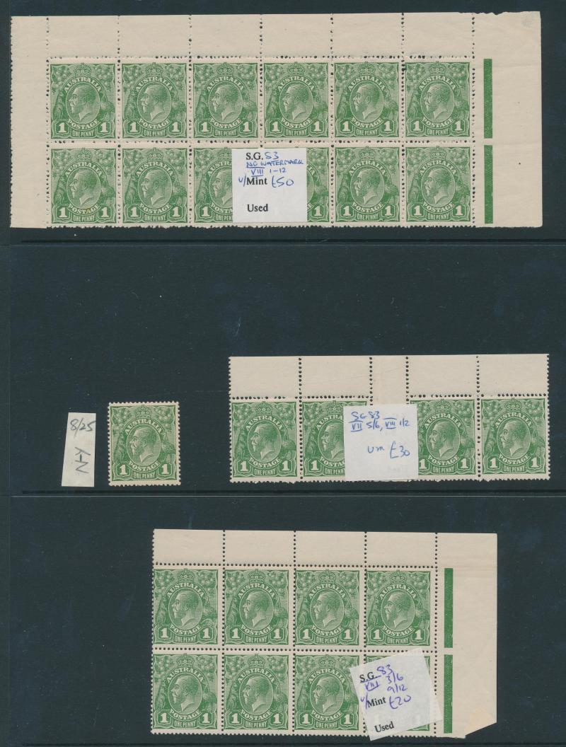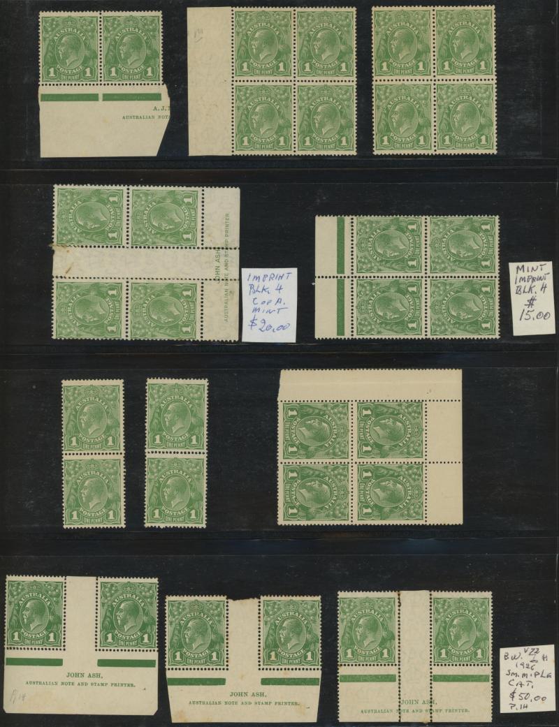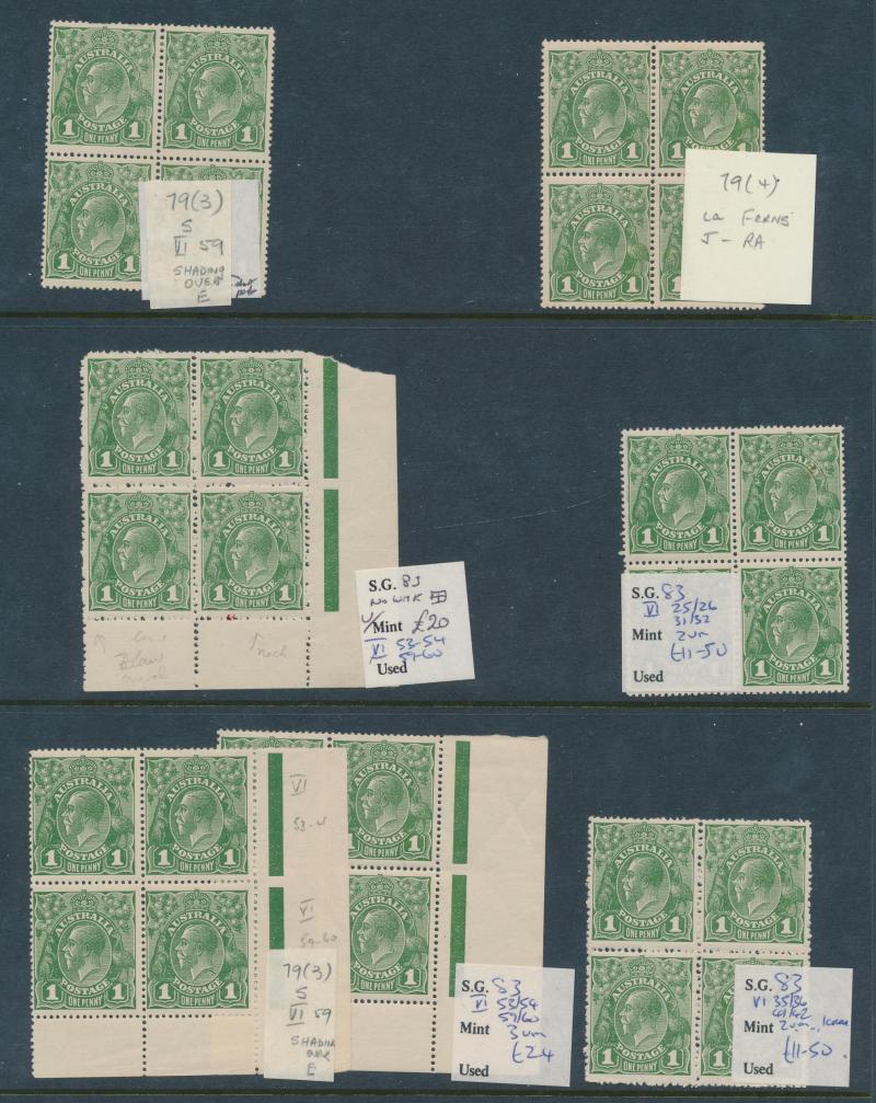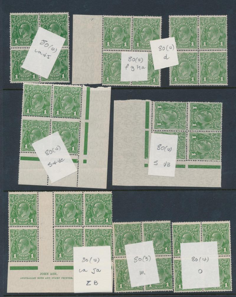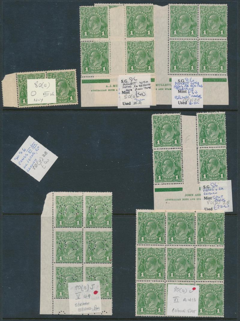 1356 og/nh imageONE PENNY GREEN: Accumulation with many plated varieties in multiples including Single Wmk blocks of 4 x20+, block of 9 with Dot before '1' and cross-gutter block of 24 with 'Secret Mark' & Pearl Flaw, etc, Large Multiple Wmk blocks of 4 x8, blocks of 6 & block of 8, No Wmk blocks of 4 x18, blocks of 6 x3, block of 8 & blocks of 12 x2, Small Multiple Wmk Perf 14 blocks of 4 x60+ including one with Corner Dot & Run 'N' (scarce unretouched) and a number with Wattle Line & Neck Flaw including retouches, and so on including CofA Wmk 'OS' Overprints noted a block of 20 with Notched Upper Left Corner, White Scratch Right of Crown & Deformed Shading over 'E' of 'POSTAGE', also Watermark Inverted, punctured 'OS', lots of imprint blocks, and many, many more, condition a little variable but generally fine to very fine, enormous catalogue value. Weighs 3kg. Ex Graeme Stephensen. (many 100s) (Image1) (Image2) (Image3) (Image4) (Image5) (Image6) (Image7) (Image8) (Image9) (Image10) (Image11) (Image12) (Image13) (Image14) (Image15) (Image16) (Image17) (Image18) (Image19) (Image20) (Image21) (Image22) (Image23) (Image24) (Image25) (Image26) (Image27) (Image28)