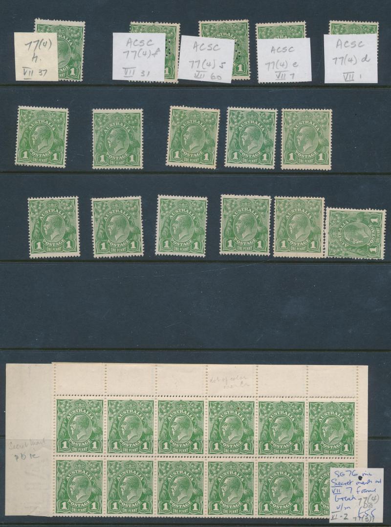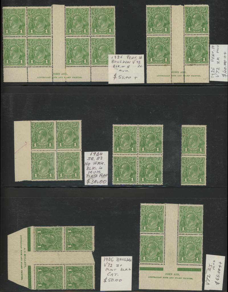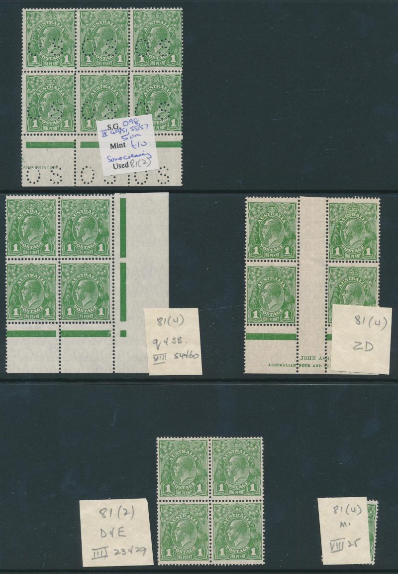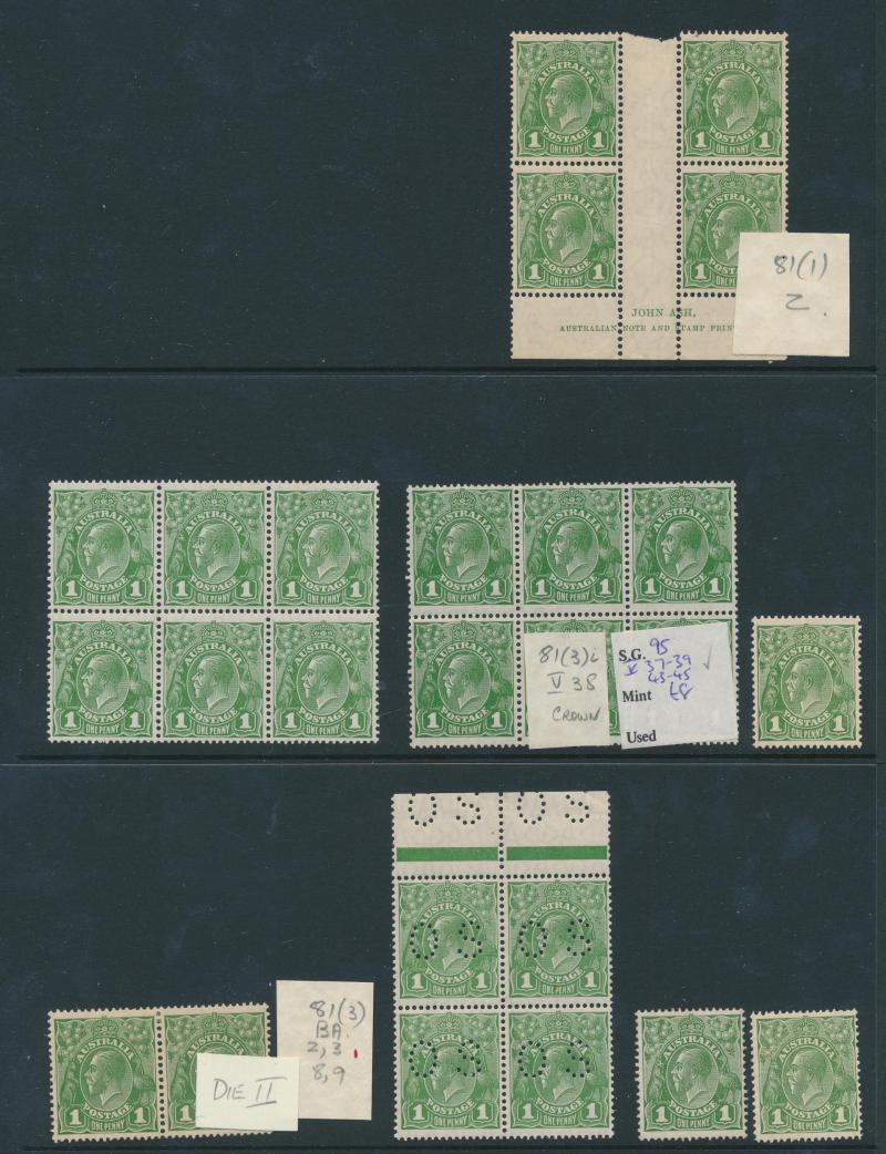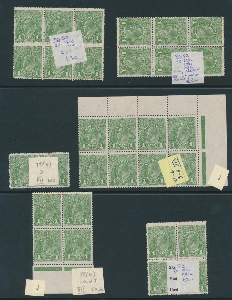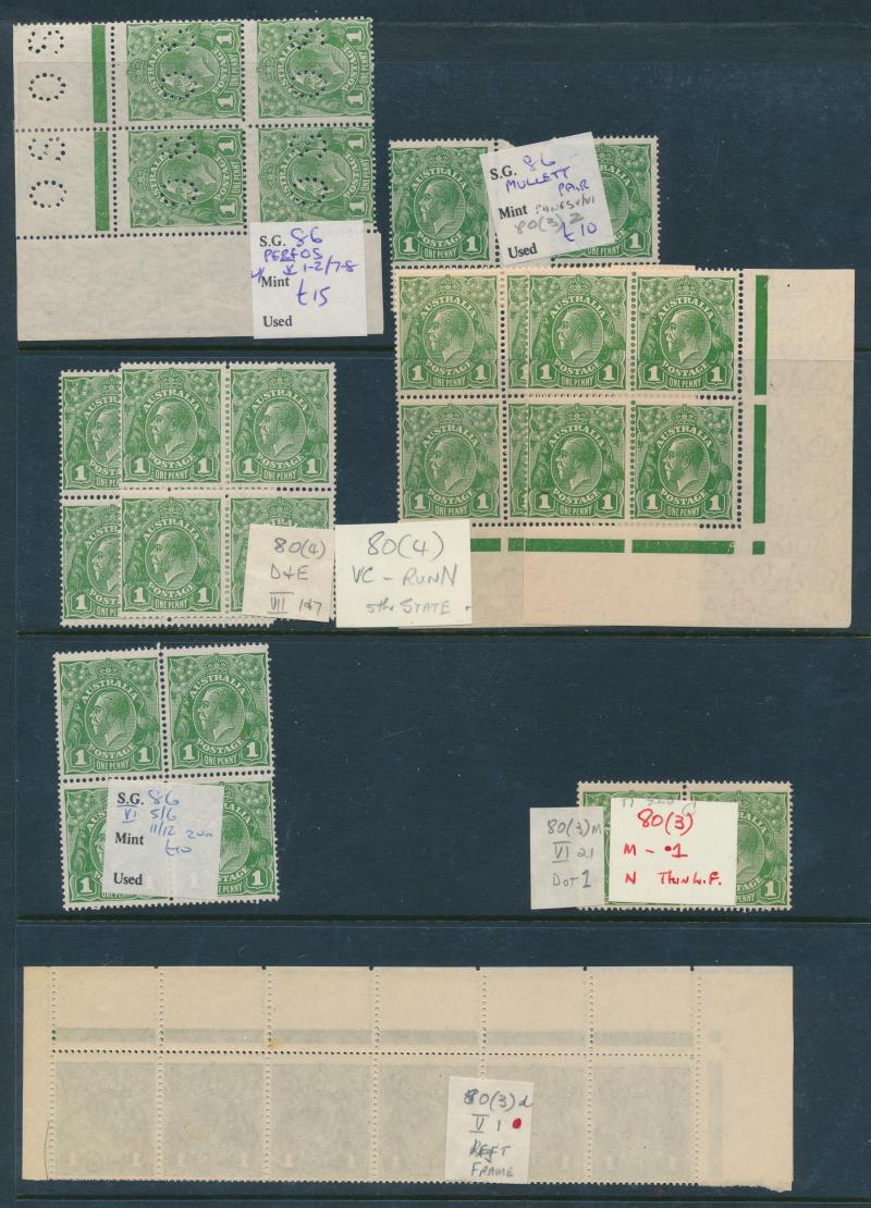 1356 og/nh imageONE PENNY GREEN: Accumulation with many plated varieties in multiples including Single Wmk blocks of 4 x20+, block of 9 with Dot before '1' and cross-gutter block of 24 with 'Secret Mark' & Pearl Flaw, etc, Large Multiple Wmk blocks of 4 x8, blocks of 6 & block of 8, No Wmk blocks of 4 x18, blocks of 6 x3, block of 8 & blocks of 12 x2, Small Multiple Wmk Perf 14 blocks of 4 x60+ including one with Corner Dot & Run 'N' (scarce unretouched) and a number with Wattle Line & Neck Flaw including retouches, and so on including CofA Wmk 'OS' Overprints noted a block of 20 with Notched Upper Left Corner, White Scratch Right of Crown & Deformed Shading over 'E' of 'POSTAGE', also Watermark Inverted, punctured 'OS', lots of imprint blocks, and many, many more, condition a little variable but generally fine to very fine, enormous catalogue value. Weighs 3kg. Ex Graeme Stephensen. (many 100s) (Image1) (Image2) (Image3) (Image4) (Image5) (Image6) (Image7) (Image8) (Image9) (Image10) (Image11) (Image12) (Image13) (Image14) (Image15) (Image16) (Image17) (Image18) (Image19) (Image20) (Image21) (Image22) (Image23) (Image24) (Image25) (Image26) (Image27) (Image28)
