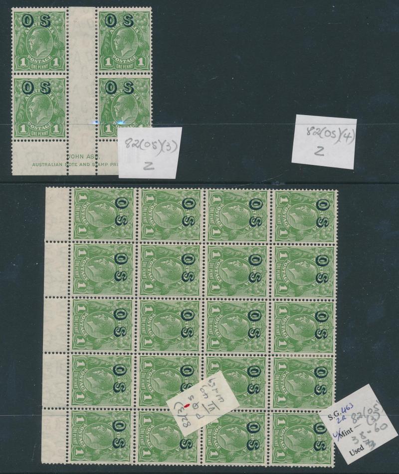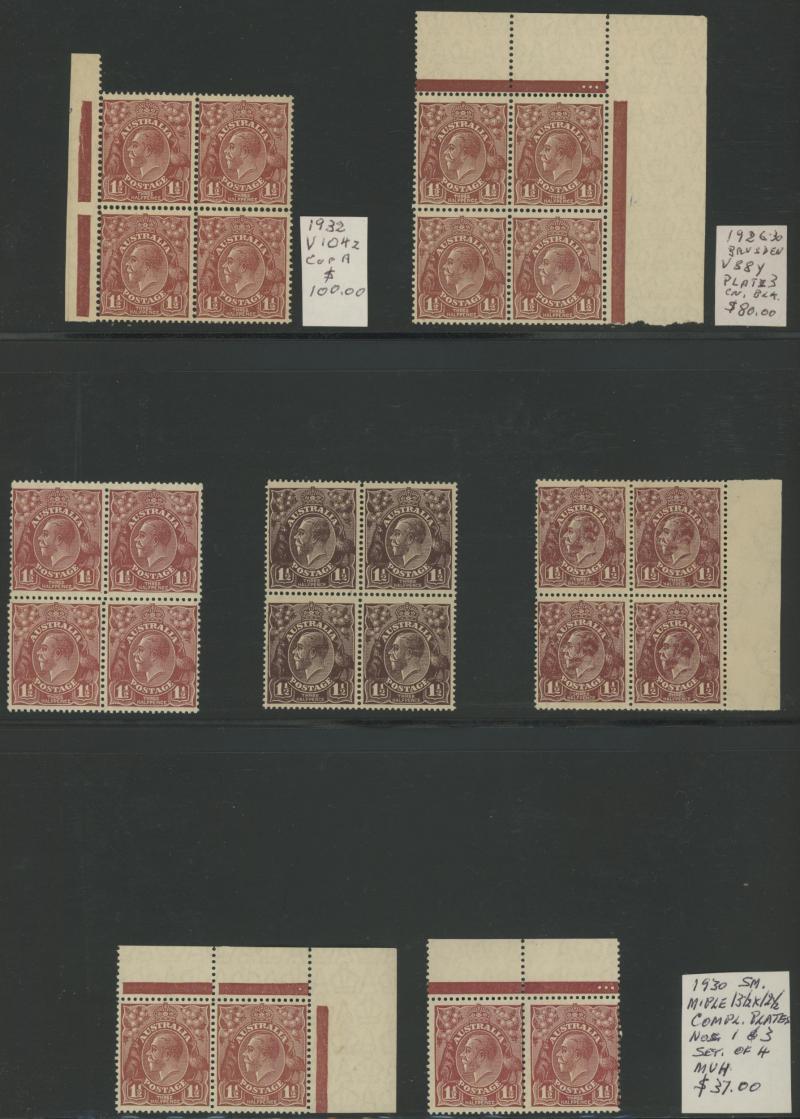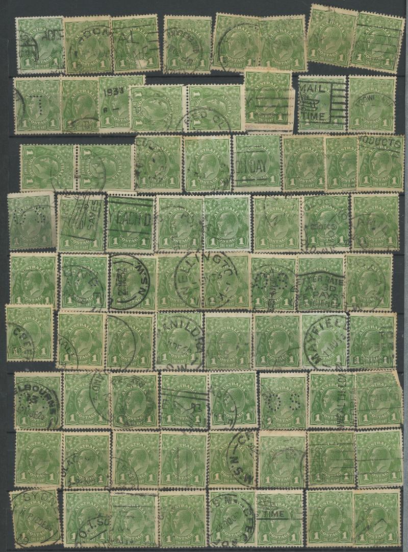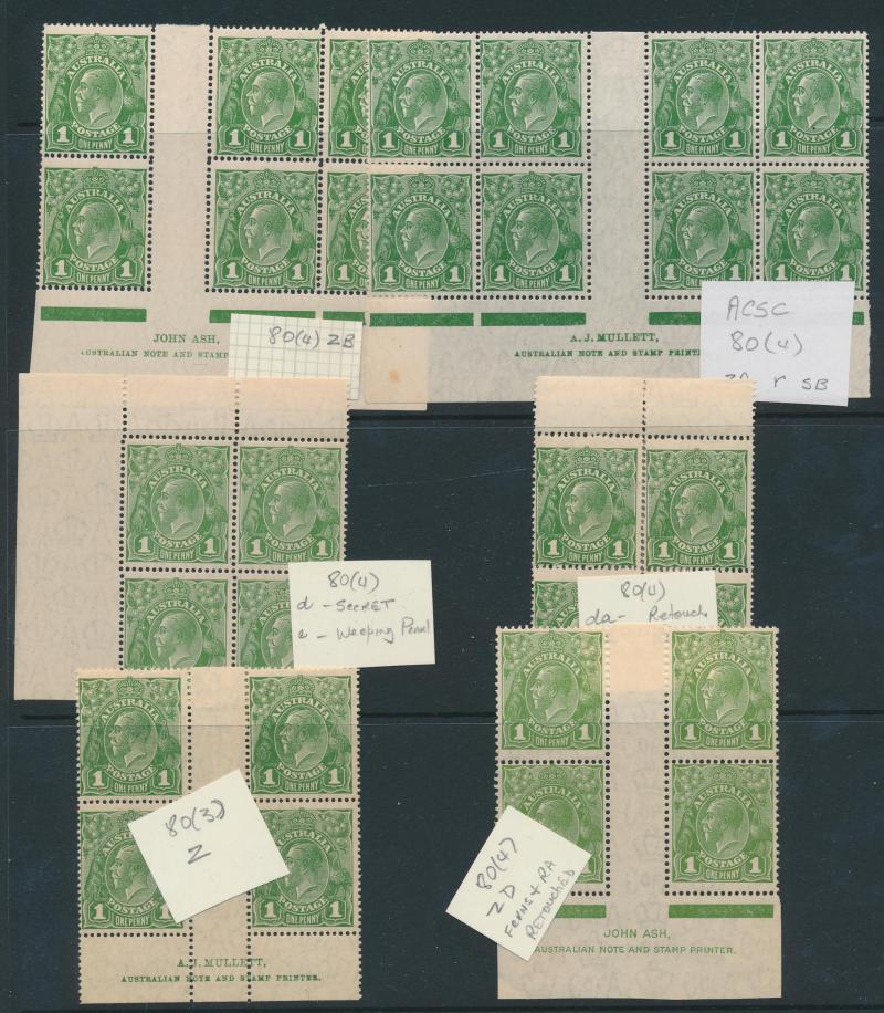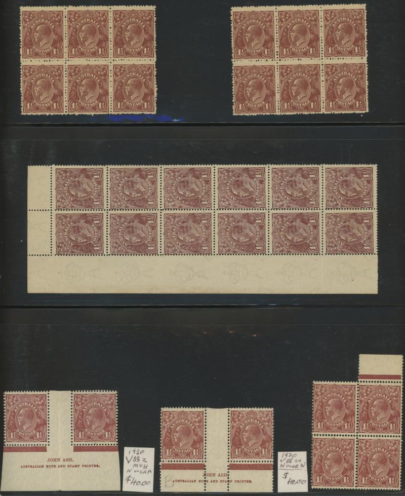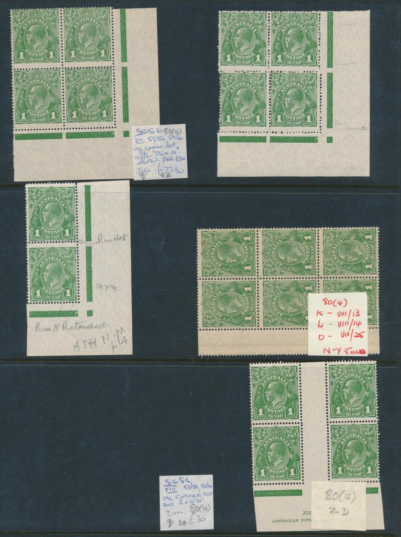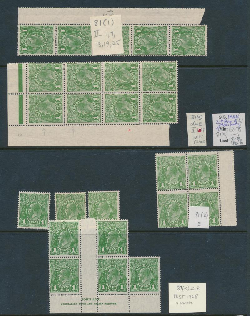 1356 og/nh imageONE PENNY GREEN: Accumulation with many plated varieties in multiples including Single Wmk blocks of 4 x20+, block of 9 with Dot before '1' and cross-gutter block of 24 with 'Secret Mark' & Pearl Flaw, etc, Large Multiple Wmk blocks of 4 x8, blocks of 6 & block of 8, No Wmk blocks of 4 x18, blocks of 6 x3, block of 8 & blocks of 12 x2, Small Multiple Wmk Perf 14 blocks of 4 x60+ including one with Corner Dot & Run 'N' (scarce unretouched) and a number with Wattle Line & Neck Flaw including retouches, and so on including CofA Wmk 'OS' Overprints noted a block of 20 with Notched Upper Left Corner, White Scratch Right of Crown & Deformed Shading over 'E' of 'POSTAGE', also Watermark Inverted, punctured 'OS', lots of imprint blocks, and many, many more, condition a little variable but generally fine to very fine, enormous catalogue value. Weighs 3kg. Ex Graeme Stephensen. (many 100s) (Image1) (Image2) (Image3) (Image4) (Image5) (Image6) (Image7) (Image8) (Image9) (Image10) (Image11) (Image12) (Image13) (Image14) (Image15) (Image16) (Image17) (Image18) (Image19) (Image20) (Image21) (Image22) (Image23) (Image24) (Image25) (Image26) (Image27) (Image28)