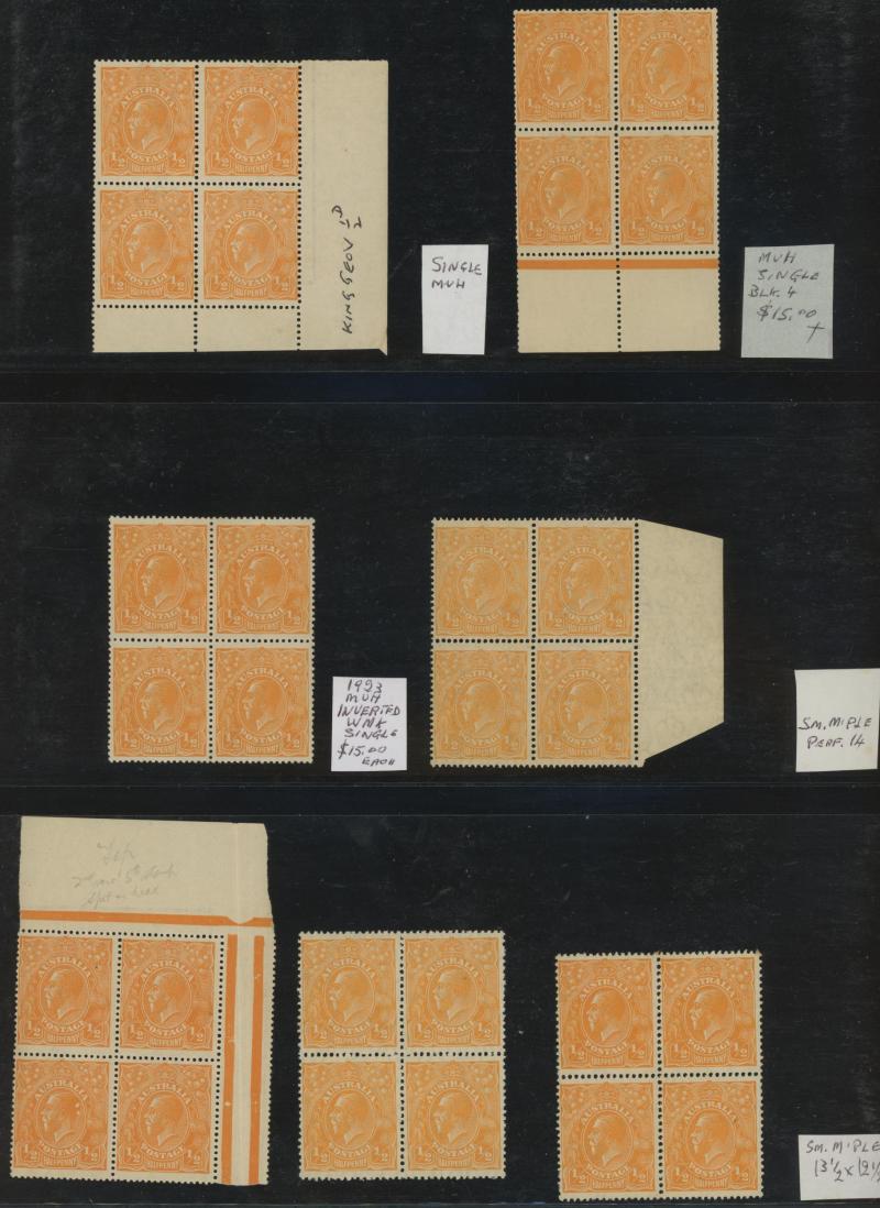 1351 og/nhO imageInverted Watermarks selection mostly Single Wmk including 1d red Rough Paper, 1½d black-brown, 4d orange, 4d blue (**) & two pairs that were previously a block of 4; LMult Wmk 1½d black-brown x4 & 1½d red-brown; SMult Wmk Perf 14 1d green block of 4; Perf 13½x12½ 3d Die I marginal (**); etc, also a few used stamps, condition variable but generally fine to very fine. (40) (Image1)