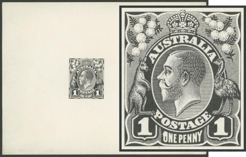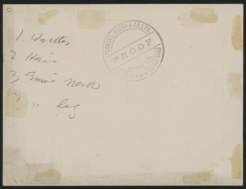 1359 P image1d die proof in black on highly glazed thin card (125x95mm; full size) State 2 with a field of horizontal lines behind the King's head and no endorsements on the face ACSC 70(DP)12Ac, 'PERKINS BACON & CO LTD/PROOF/...' cachet on the reverse where endorsed in pencil "2" along with a list of required changes "1. Wattles, 2. Hair, 3. Emu's Neck, 4. Leg", multiple hinge remnants on the back and a couple of very light marks on the card, the impression very fine, Cat $12,500. Ex Perkins Bacon Archives. Six examples recorded. (Image1) (Image2)