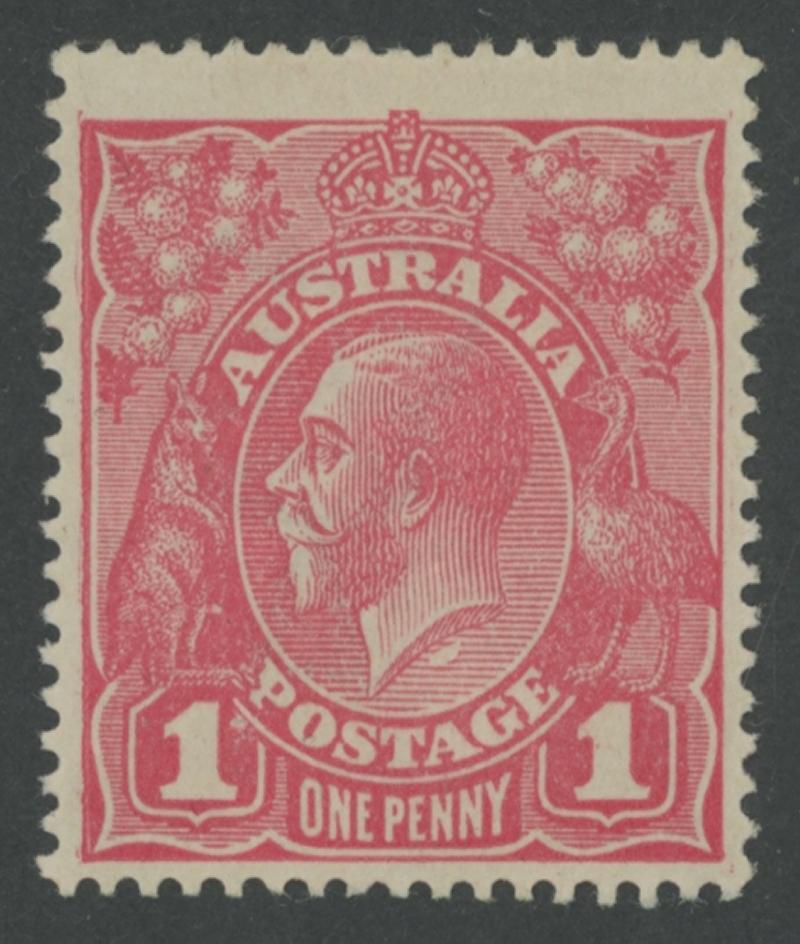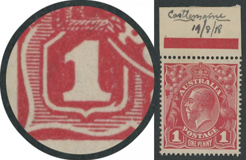 1363 nh image1d red Smooth Paper Comb Perf Die II ACSC 71(1)i (SG 21d), marginal example from the top of the sheet well-centred, unmounted, Cat $1250 (£425+ for mounted). Endorsed "Castlemaine 19/8/18" in ink in the margin, presumably the place & date of purchase. (Image1) (Image2)