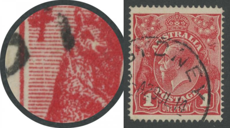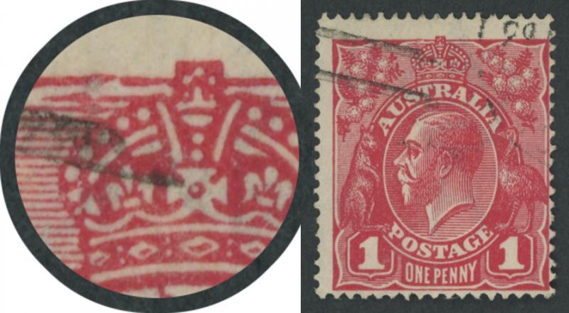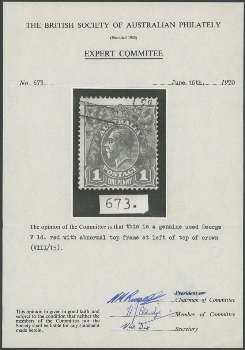 1367 G image1d red Smooth Paper Comb Perf with Break in Top Frame to left of Crown [Pos VIII/15] ACSC 71(4)m, partial indistinct machine cancel just clear of the variety, Cat $6500. BSAP Certificate (1970) signed by Neil Russell, Henry Eldridge & Prof Victor Dix. This flaw did not develop until 1919, and is therefore rare in red printings. Andrew Johnston's similarly-centred example - rounded corner; the first example we had offered - sold at our auction of 19.9.2023 for $1920 (Sale 253 Lot 310). (Image1) (Image2) (Image3)