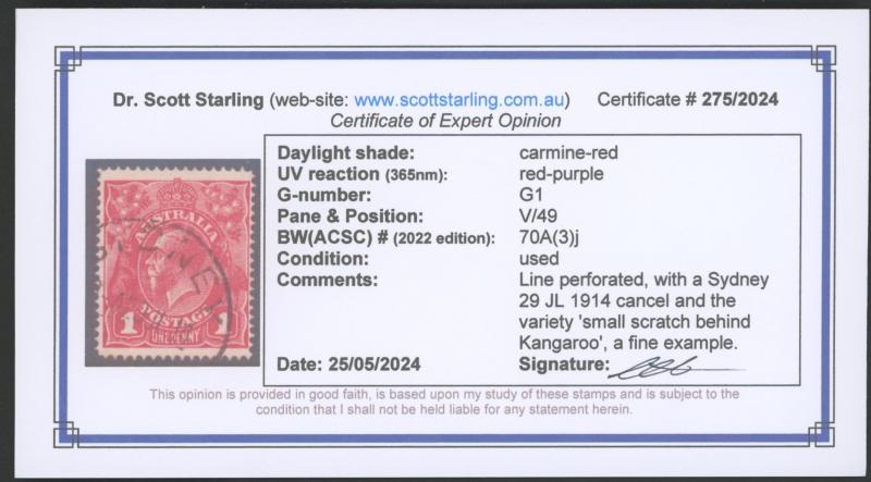 1360 F image1d carmine-red Single-Line Perf ACSC 70A (SG ) with White Scratch behind Kangaroo [Pos V/49] ACSC 70(3)j, Sydney '29JL14' cds cancel just clear of the variety, Cat $350. Scott Starling Certificate (2024). Andrew Johnston's similarly-centred example sold at our auction of 19.9.2023 for $432 (Sale 253 Lot 270). (Image1) (Image2) (Image3)