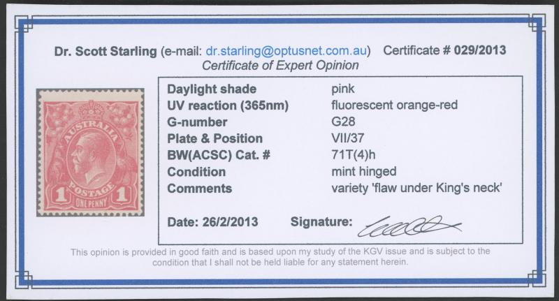 1361 og image1d pink Smooth Paper Comb Perf (G28) ACSC 71T with Flaw under Neck [Pos VII/37] ACSC 71(4)h, small hinge remainder, Cat $900. Scott Starling Certificate (2013). (Image1) (Image2) (Image3)