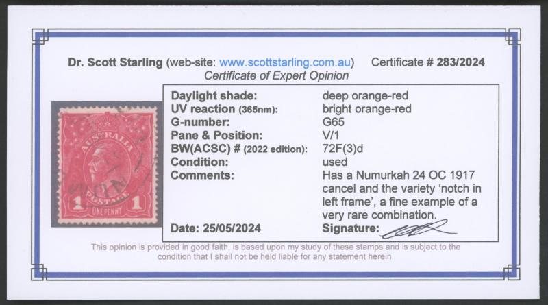 1370 F image1d deep orange-red Rough Paper Comb Perf (G65) ACSC 72F with Notch in Left Frame behind Kangaroo [Pos V/1] ACSC 72(3)d, light partial Numurkah, Vic '24OC17' cds cancel clear of the variety, well-centred, a few slightly uneven perfs, Cat $1200. Scott Starling Certificate (2024) states "very rare combination" of shade & variety. (Image1) (Image2) (Image3)