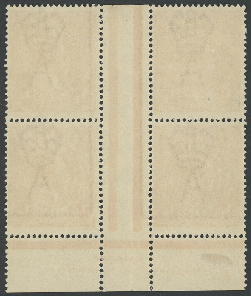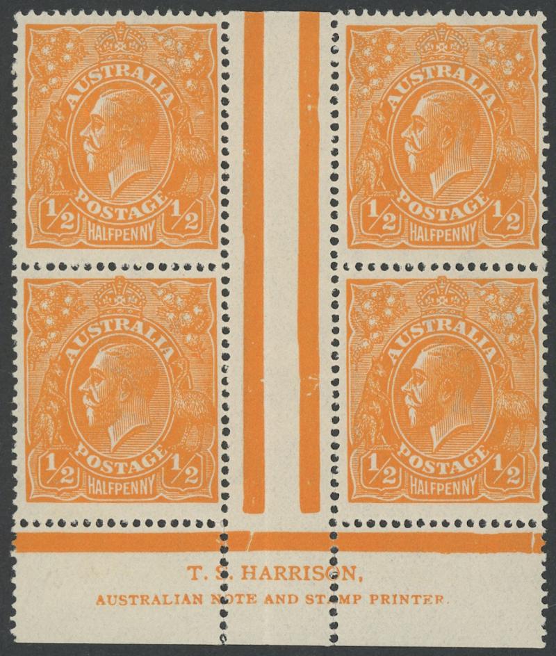 1358 nh image½d orange SG 56 Electro 6 TS Harrison imprint block of 4 with Retouched Crack through King's Ear [Pos 6L54] and Eight Wattles at Right [Pos 6R49] ACSC 66(6)z, small hinge remainder in lower margin only, the stamps all unmounted, Cat $400+ for mounted. Ex Andrew Johnston: sold at our auction of 19.9.2023 for $264 (Sale 253 Lot 233). (Image1) (Image2)