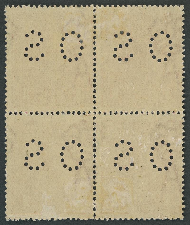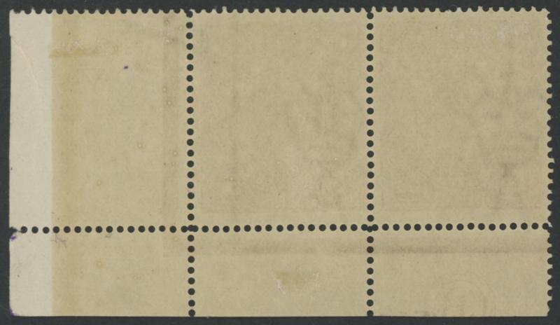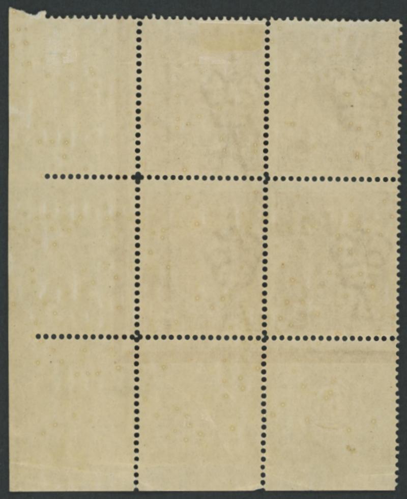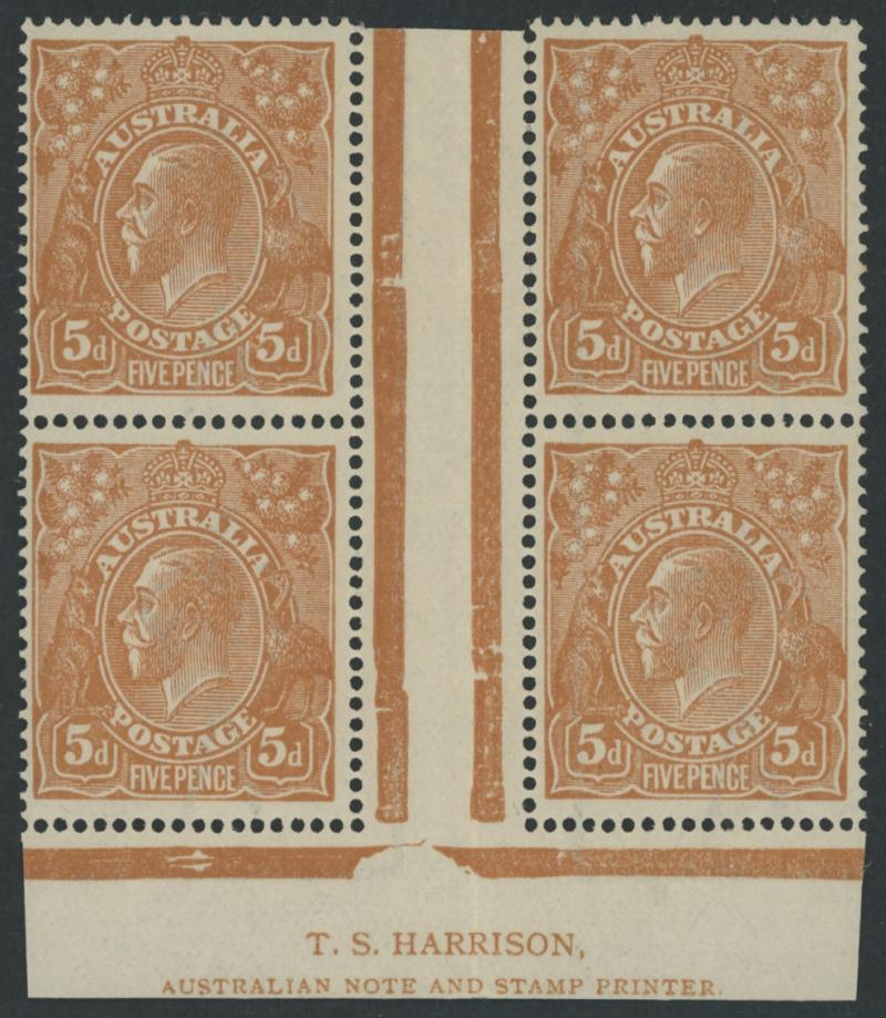 1417 nh/og image5d yellow-brown 'TS HARRISON' Two-Line Imprint block of 4 ACSC 123Ezf, unusually well-centred for an imprint block and unusually with both lines of the imprint, the upper-right unit lightly mounted otherwise unmounted, Cat $9500 for a mounted block of 4; unpriced unmounted. Superb: a rare and desirable block. The ACSC states that "most imprints are cut and show only the first line, price $2750". (Image1) (Image2)
