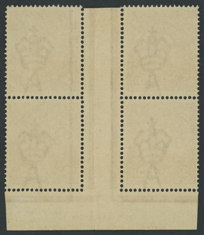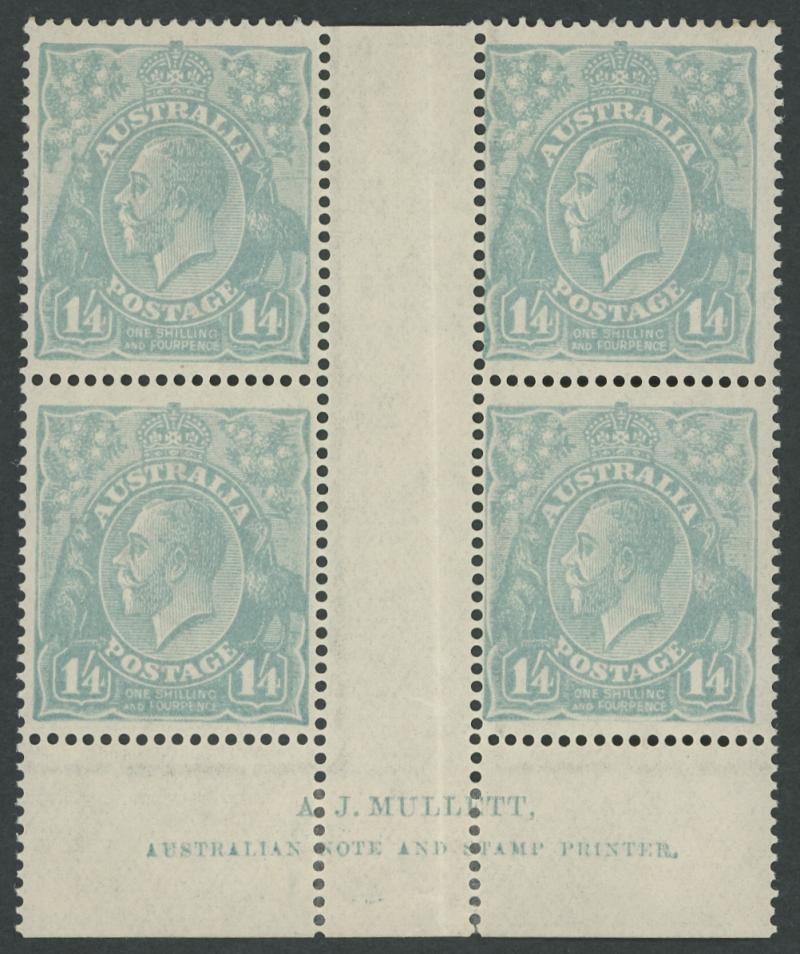 1420 og image1/4d pale greenish-blue SG 66a AJ Mullett Imprint block of 4 ACSC 128Bza, perf reinforcing in the lower margin only, the upper units lightly mounted, the lower units unmounted, Cat $4500+ for mounted. Ex Arthur Gray - sold at our auction of 30.10.2015 for $2142 (Sale 207 Lot 258) - and Gerald Fon. (Image1) (Image2)