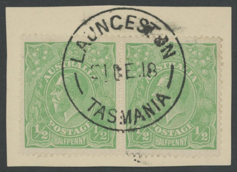 1426 F image½d blue-green with Thin '1' in Fraction at Right ACSC 65(5)s (SG 48a) being the left-hand unit in a horizontal pair, exceptional centring, tied to small piece by crisp 'LAUNCESTON/21DE18/TASMANIA' cds clear of the variety, Cat $250+ (£140+) for singles. Superb. (Image1) (Image2)