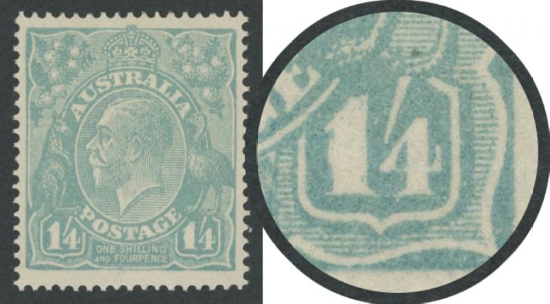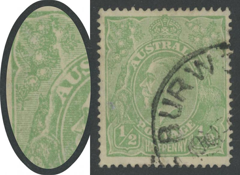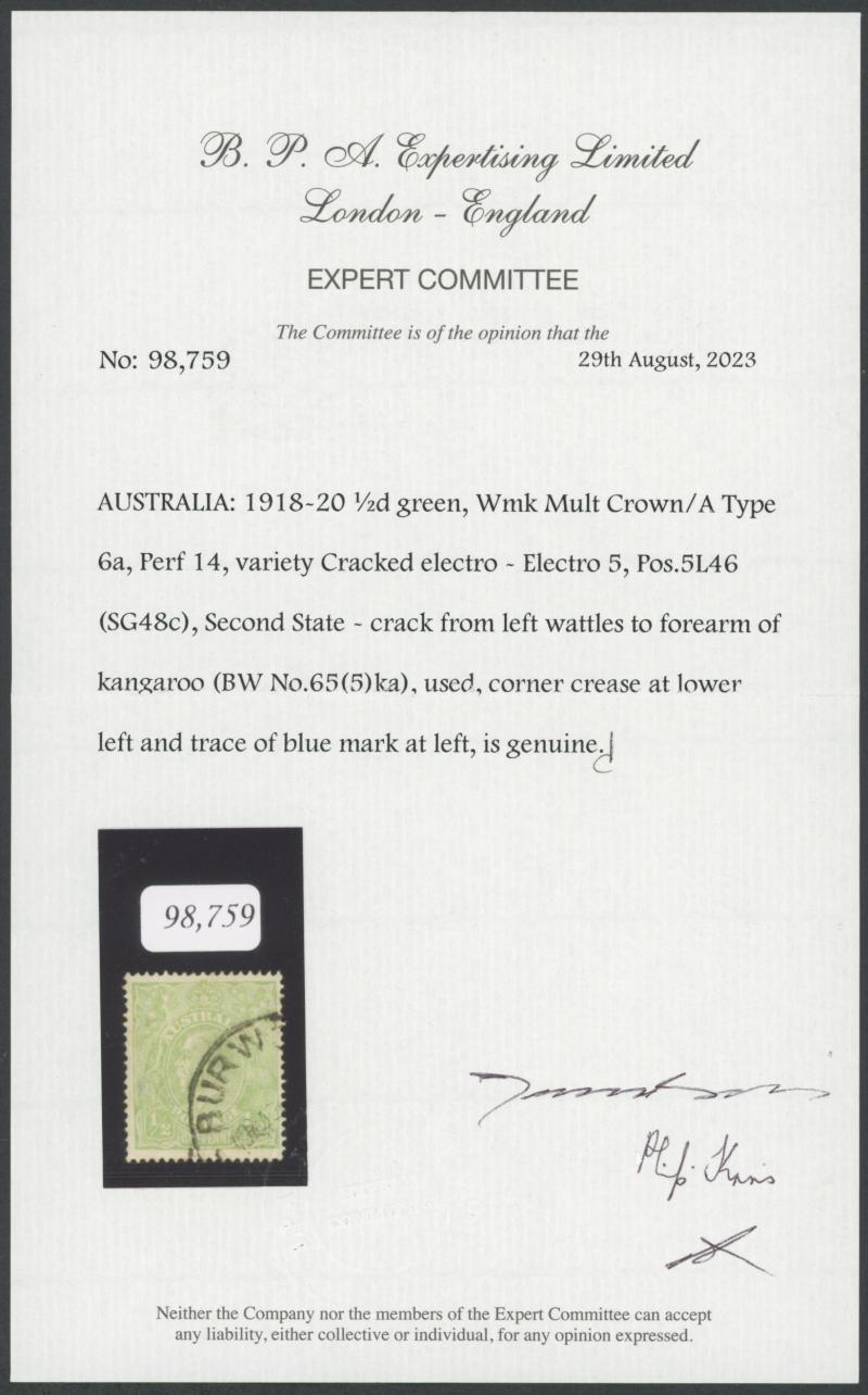 1425 F image½d pale green with Major Cracked Electro Vertically from Wattles at Upper-Left, above 'AU' of 'AUSTRALIA' and Bisecting the Kangaroo ACSC 65(5)ka (SG 48c) [Pos 5L46], well-centred, minor ironed-out crease at lower-left, 'BURWOOD/[NSW]' cds well clear of the entire crack, Cat $650 (£350). BPA Certificate (2023) mentions "trace of blue mark at left", which is extreme nit-picking. (Image1) (Image2) (Image3)