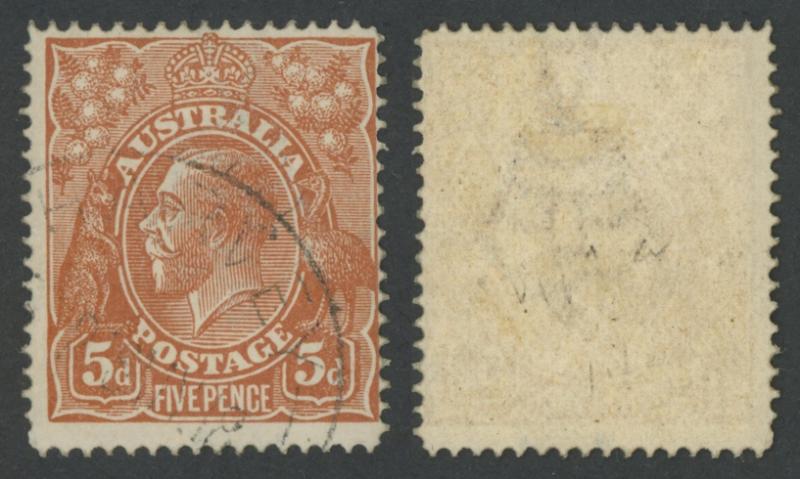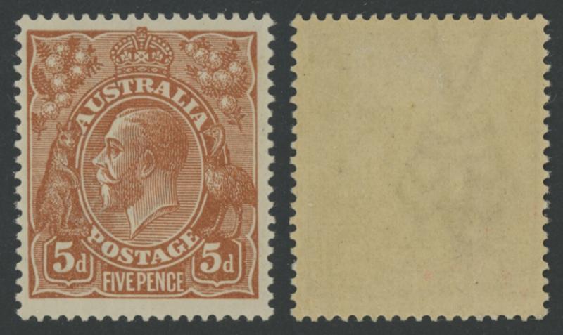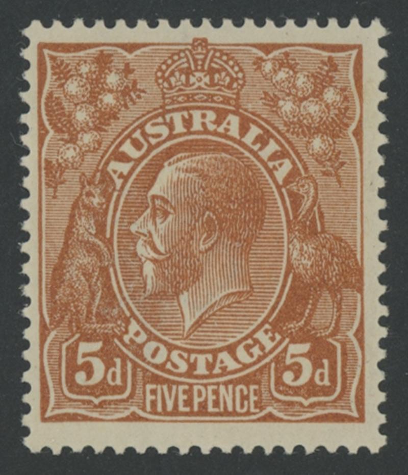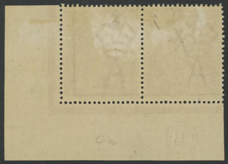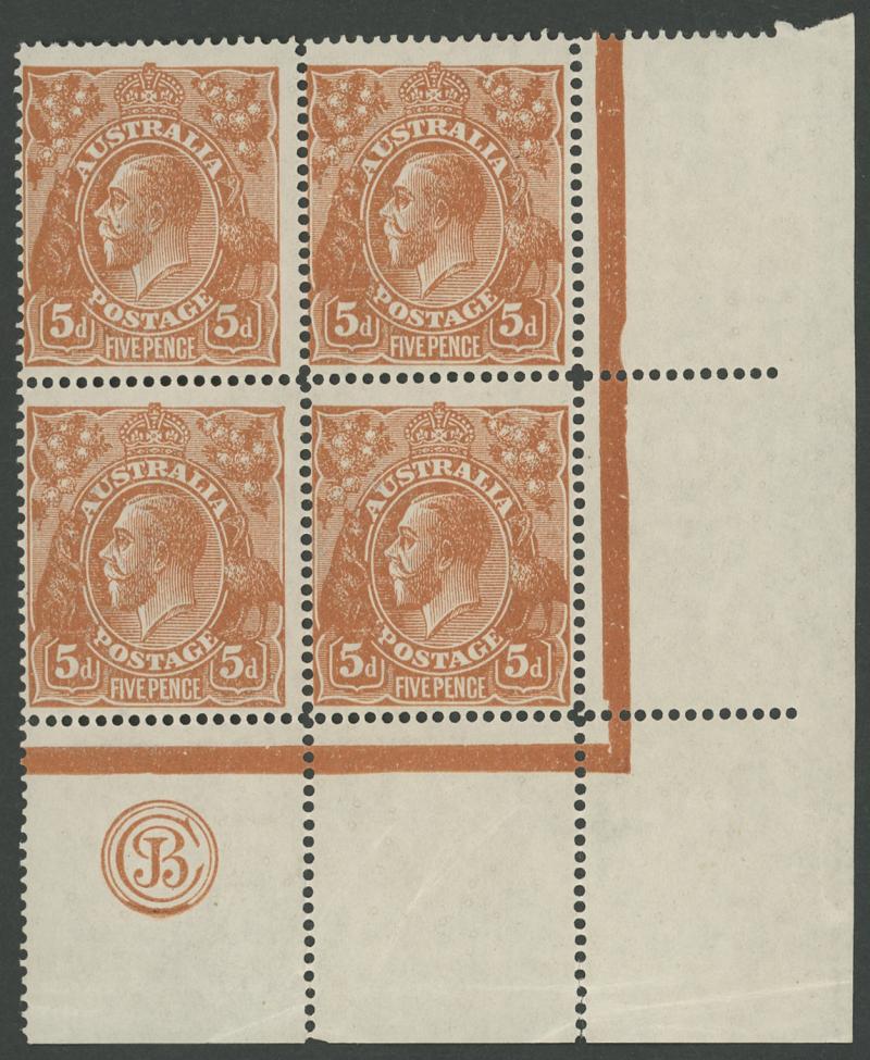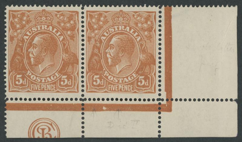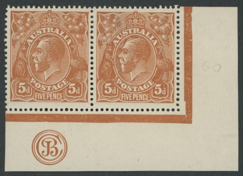 1413 og image5d yellow-brown Smooth Paper Single-Line Perf 'JBC' Monogram pair with Retouched Upper-Right Corner & Flaws on Left-Hand '5' & 'PE' of 'PENCE' ACSC 122zg [1R59-60] with about 60% of the monogram, well-centred, lightly mounted, Cat $1600. Ex 'Anglo-Saxon': sold at our auction of 16.8.2008 for $1220 (Sale 138 Lot le 138 Sale (208). (Image1) (Image2)