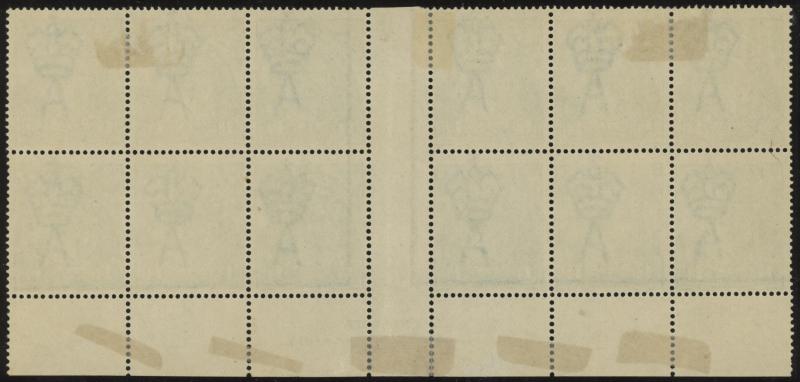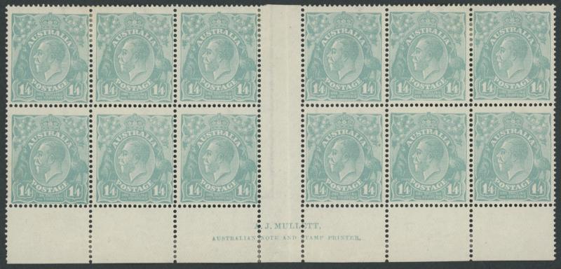 1421 og/nh image1/4d dull turquoise-blue SG 93 AJ Mullett Imprint block of 4 ACSC 128za in a block of 12 (6x2) including Thick '1' at Right [1R57], some unattractive perf-reinforcing but seven units - including the variety - are unmounted, Cat $8400+ for a mounted imprint block of 4 plus four mounted & four unmounted singles (£1800+ for mounted singles). Ex Colonel Harrie Evans: sold at our auction of 9.5.2001 for $2035 (Sale 87 Lot 558). (Image1) (Image2)