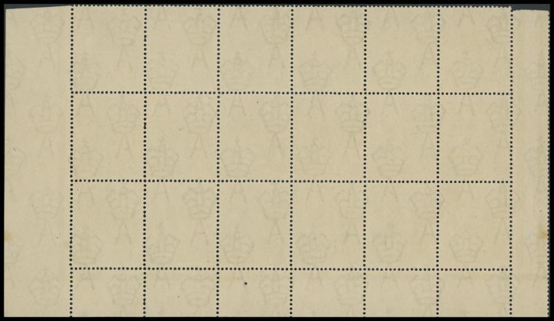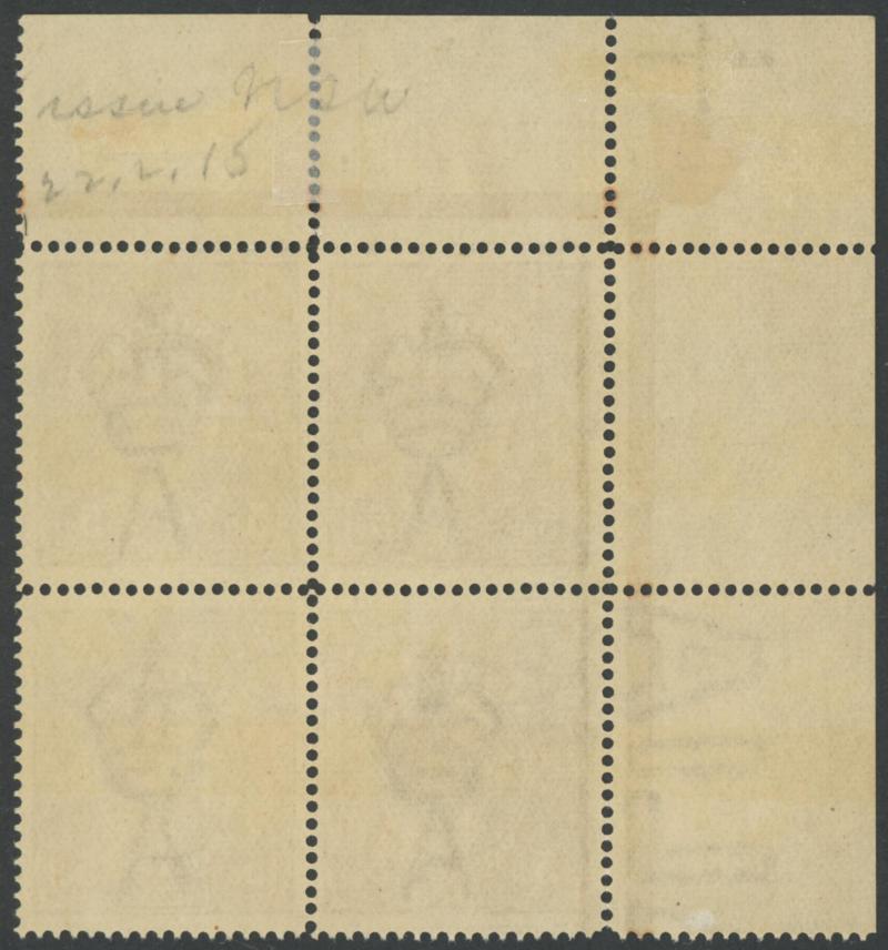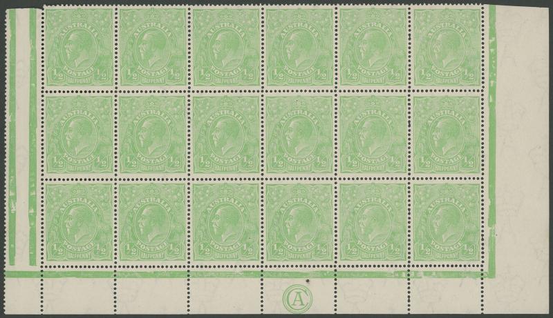 1427 nh image½d pale green SG 48 Electro 5 Substituted 'CA' Monogram strip of 3 ACSC 65(5)z in a block of 18 (6x3) with full monogram, the first unit with Thin Fraction #65(5)s (SG 48a), unusually well-centred, small black natural paper-inclusion above the monogram, unmounted, Cat $3000+ for mounted variety & monogram strip of 3 plus 14 unmounted singles. (Image1) (Image2)