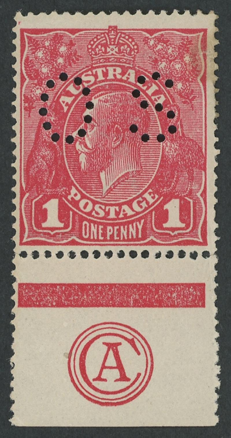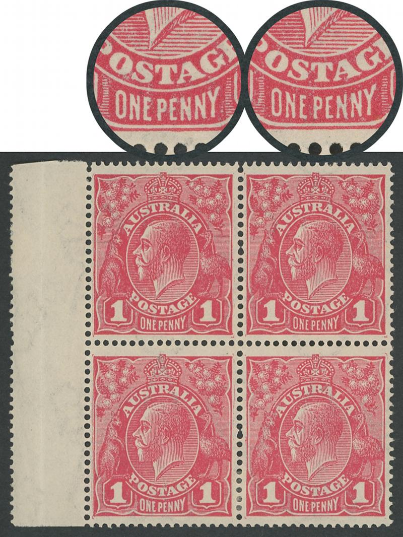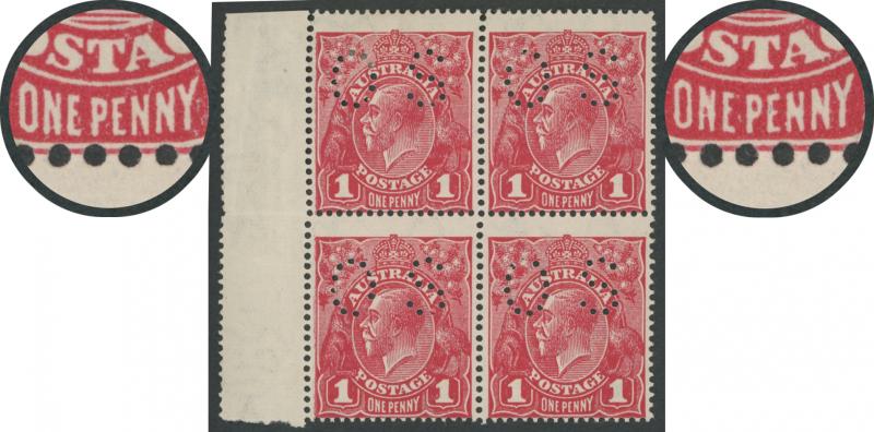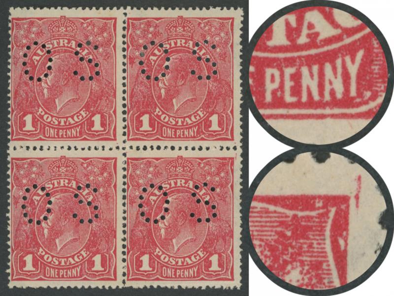 1430 og/nh image1d carmine-rose G104 Harrison Printing ACSC 74Ab (SG O63) Plate 4 block of 4, the upper two units with Distorted 'ONE PENNY' and Thin 'ONE PENNY' [Pos VIII/13-14] ACSC 74(4)k & l, characteristic poor centring, the upper units with small hinge remainders, the lower units unmounted, Cat $1700+ for two mounted & two unmounted singles (£800+ for mounted singles). Ex Graeme Stephensen. (Image1) (Image2)