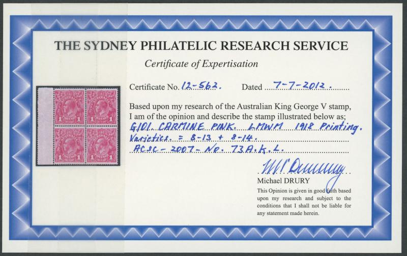 1428 og image1d carmine-pink Cooke Printings SG 49 Plate 4 marginal block of 4 from the left-hand side of the sheet, the upper-left unit with Distorted 'ONE PENNY' [Pos VIII/13] and the upper-right unit with Thin 'ONE PENNY' [Pos VIII/14] ACSC 73A(4)k & l, the upper units lightly mounted, the lower units with a small hinge remainder across both, Cat $3000+ for two mounted varieties & two singles (£1000+ for singles). Michael Drury Certificate (2012). Ex Stuart Hardy - sold in 2012 for $1689 - and Gerald Fon. (Image1) (Image2) (Image3)